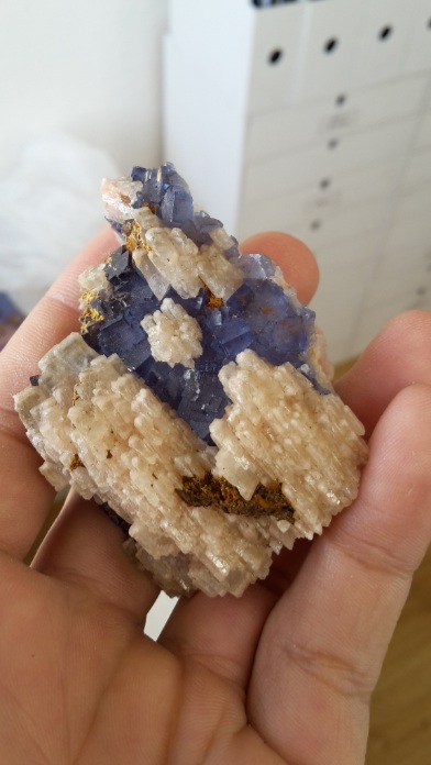 Ist ein Riesenhype um diese blauen Fluorite. Kleinstufen davon sind für vierstellige (!) Beträge nach Japan gegangen... Die sind schon sehr schön, im Tageslicht eigentlich mehr dunkel himmelblau, auf Bildern meist mehr ins violette.