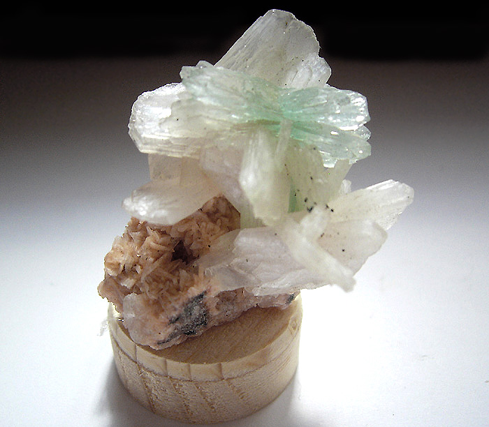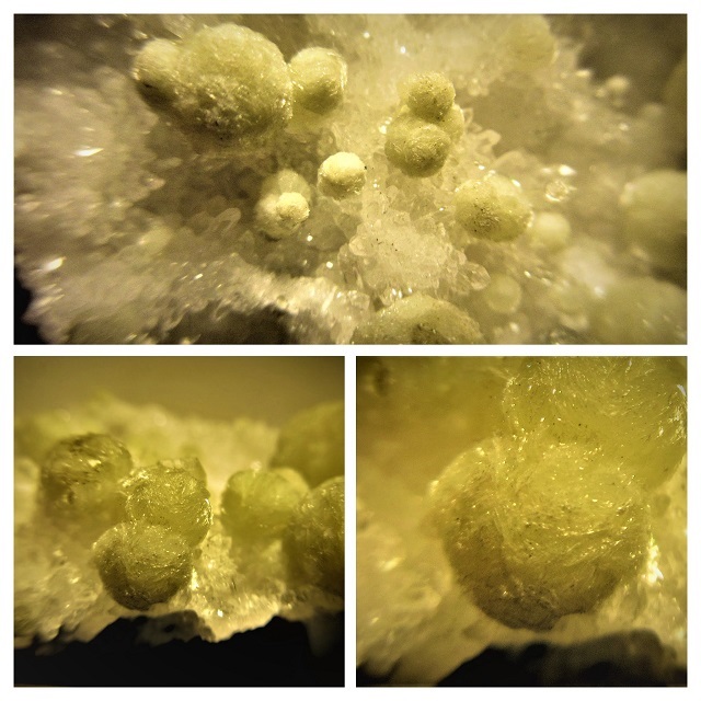 Interessant sind beigeweisse Kügelchen ,- unter 1 mm im Durchmesser - die auf den Mordenitfasern sitzen.