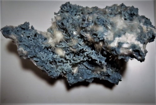 Bläulicher Chalcedon überwächst wurmartig ausgebildete Tonmineralien (Saponit,Montmorillonit) auf einer 6 x 3 cm grossen Stufe.