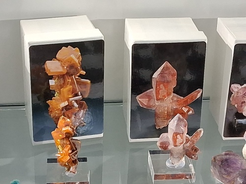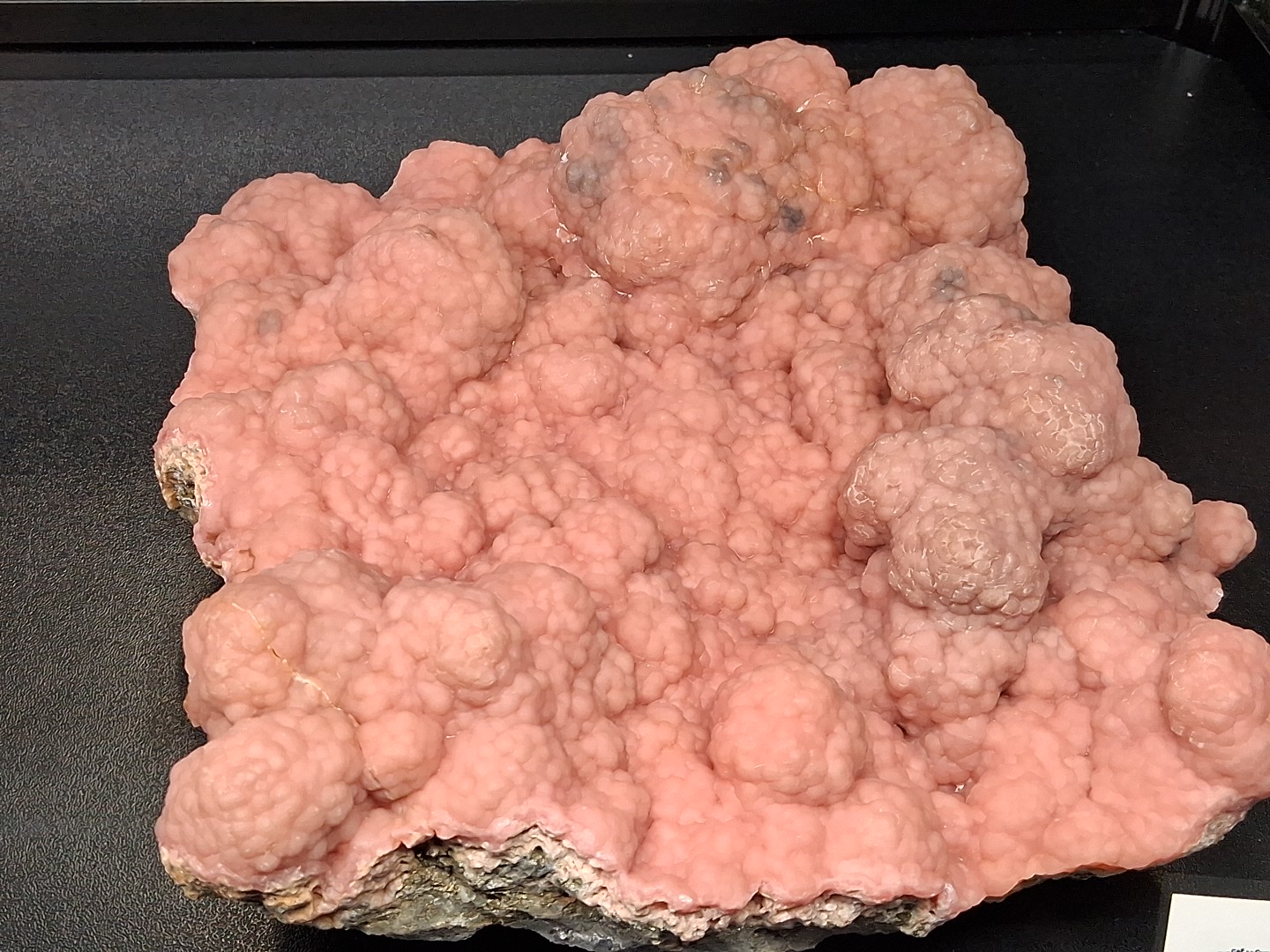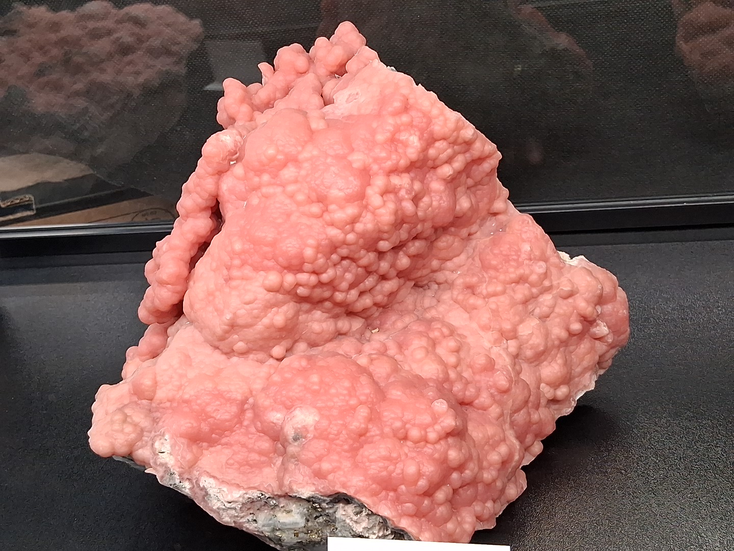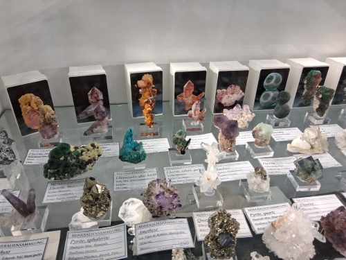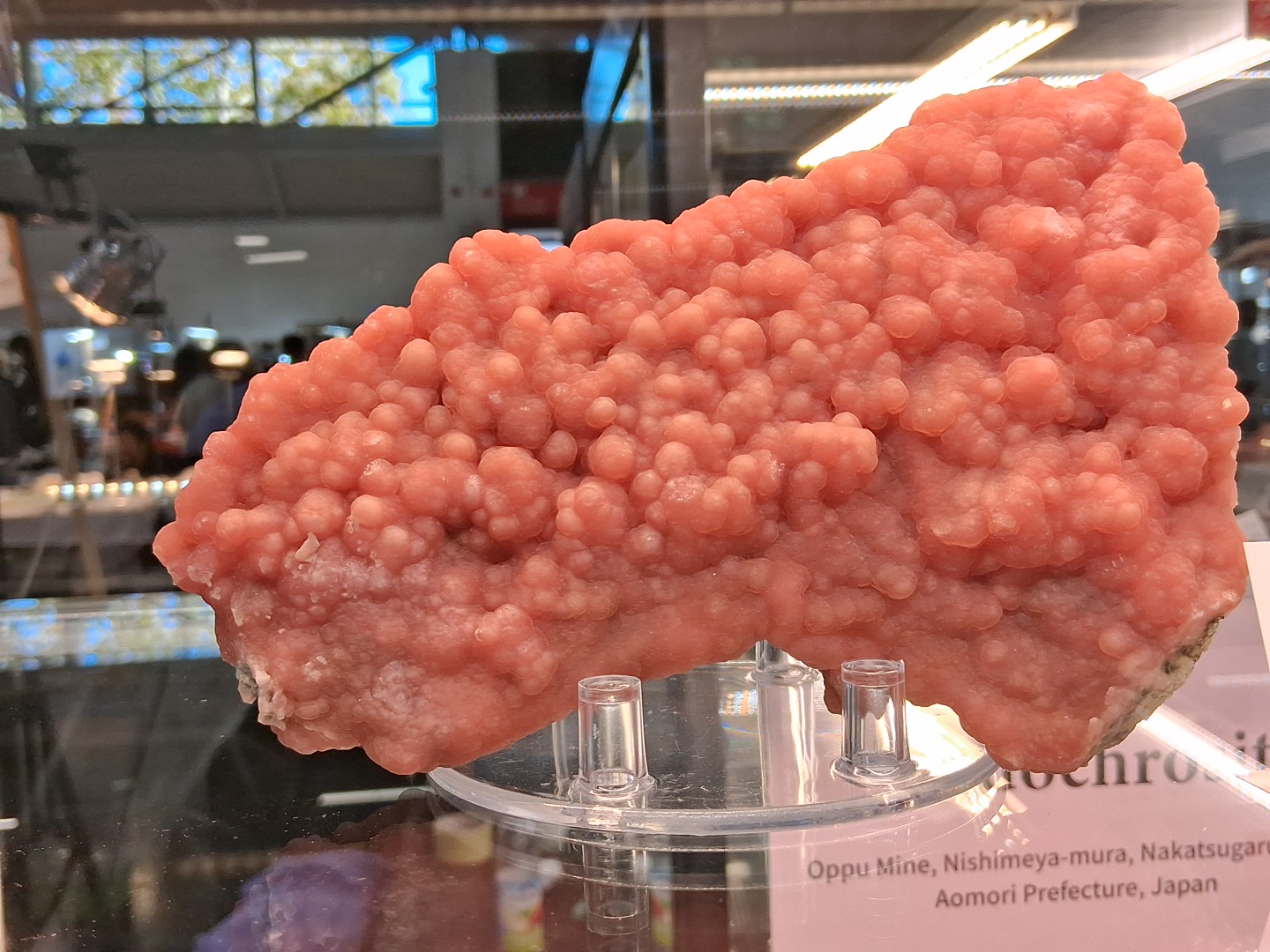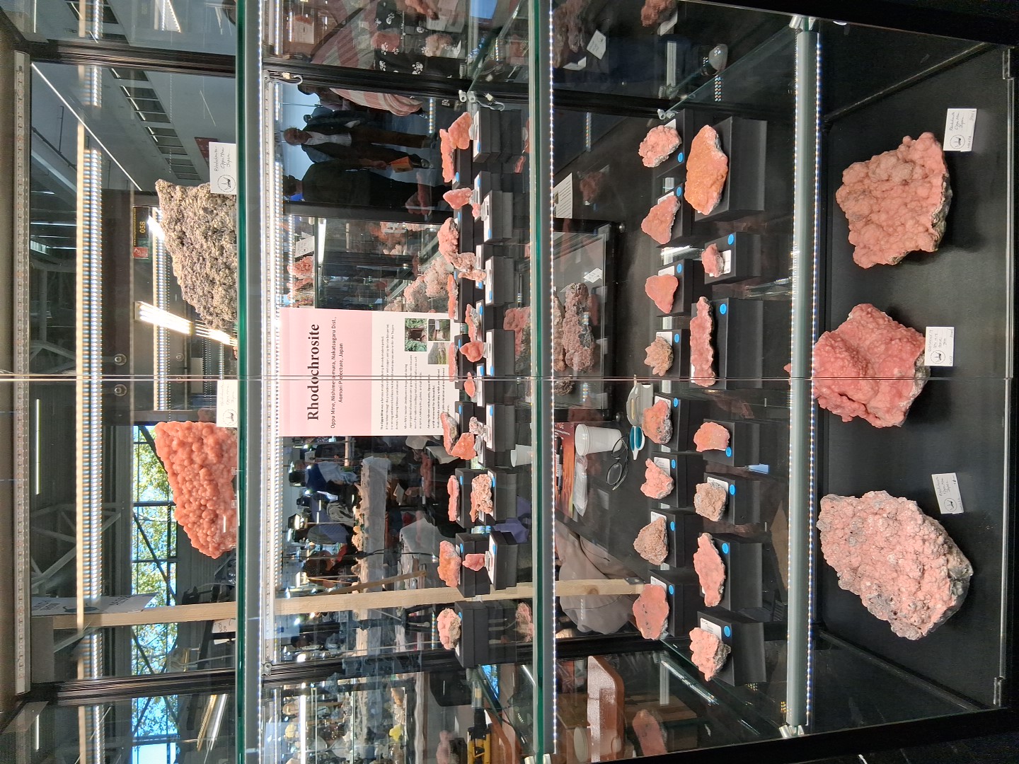 Da ist mir diese Vitrine mit japanischen Rhodochrositen aufgefallen. In dieser nierigen Ausbildung aus Japan kannte dieses Mineral noch nicht. Gekauft hab ich aber trotzdem keinen. Bessere Stufen waren recht hochbepreist, und die billigeren Kleinstufen haben mir nicht so gefallen.