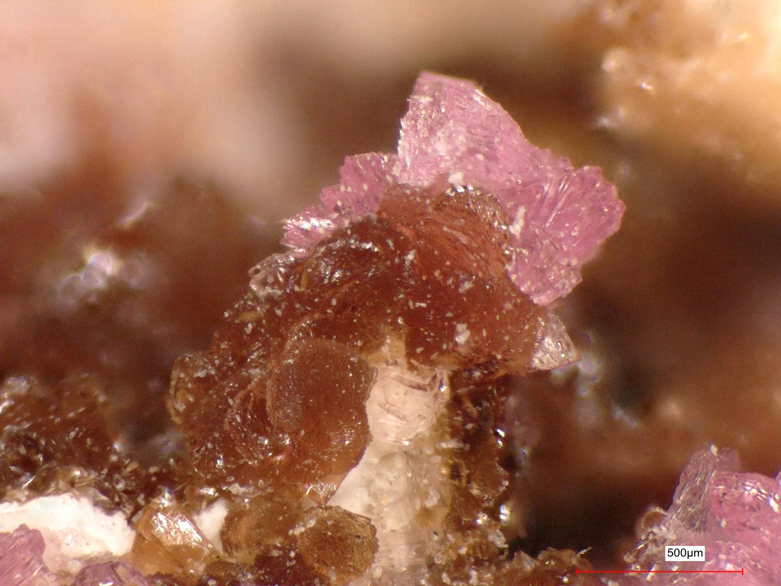 Rosafarbener Magnesiokoritnigit mit braunem Magnesiocanutit - 3 mm Ausschnitt aus einer 6,3 cm breiten Stufe. Analysiert mit SEM-EDS und Raman-Spektroskopie |