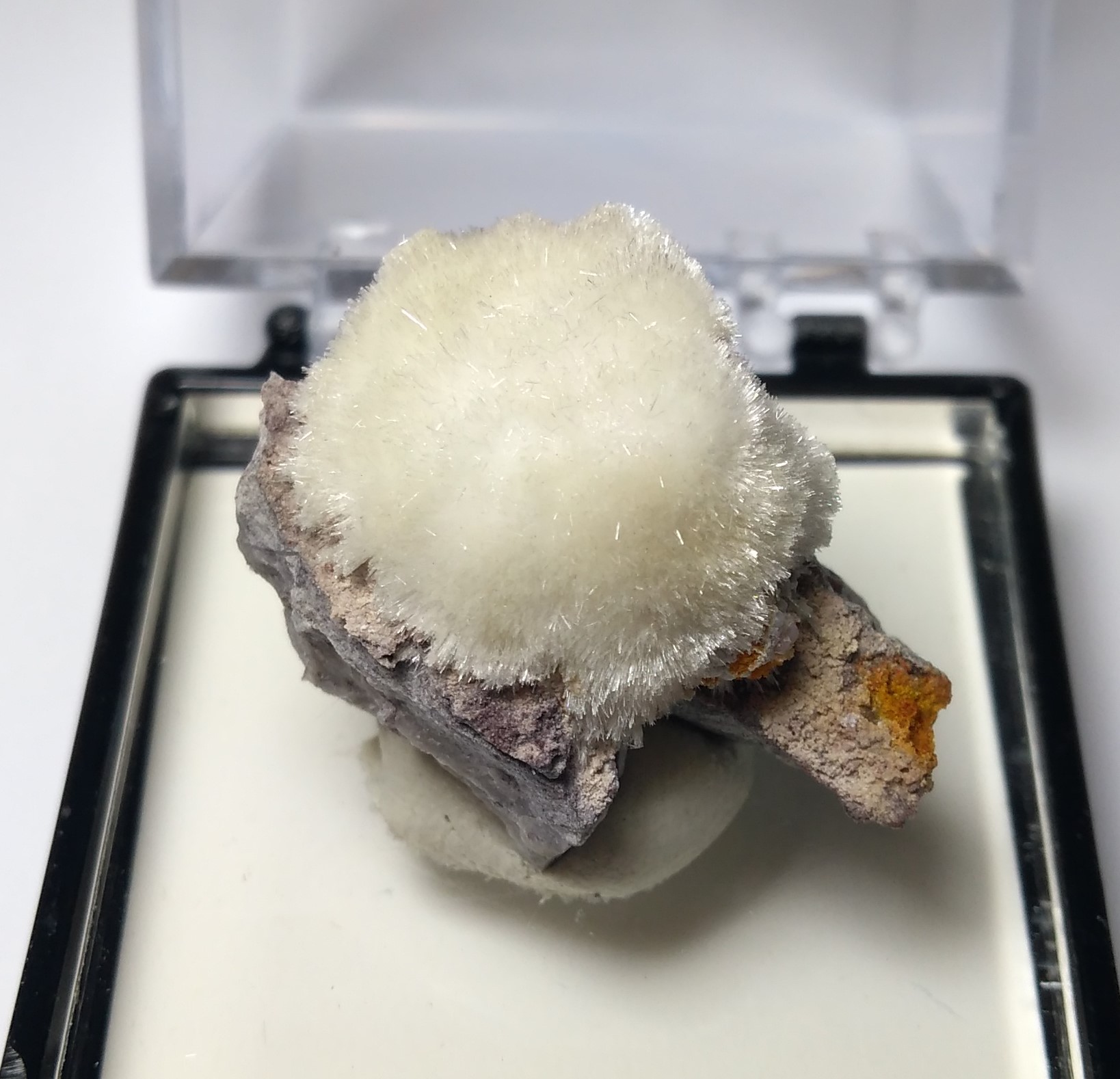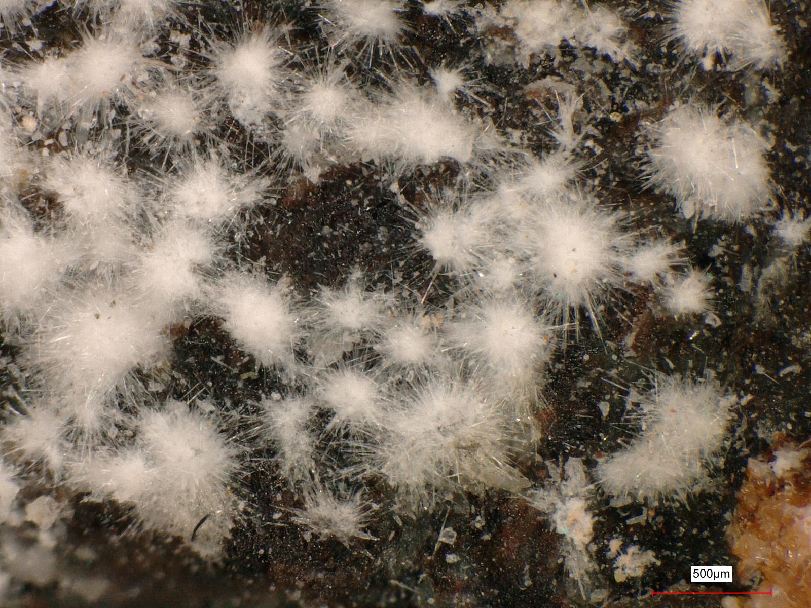 Weiße Nadeln eines unbekannten Al-Na-Fe-Chloroarsenats (Händler-Beschriftung: "Currierit") auf der Magnesiokoritnigit-Stufe. Analysiert mit SEM-EDS |