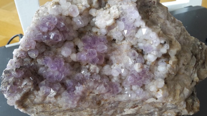 Klare Rosetten in Quarzdruse, eine seltene Ausführung von Geyer. Etwa 15 cm breite Stufe. |
