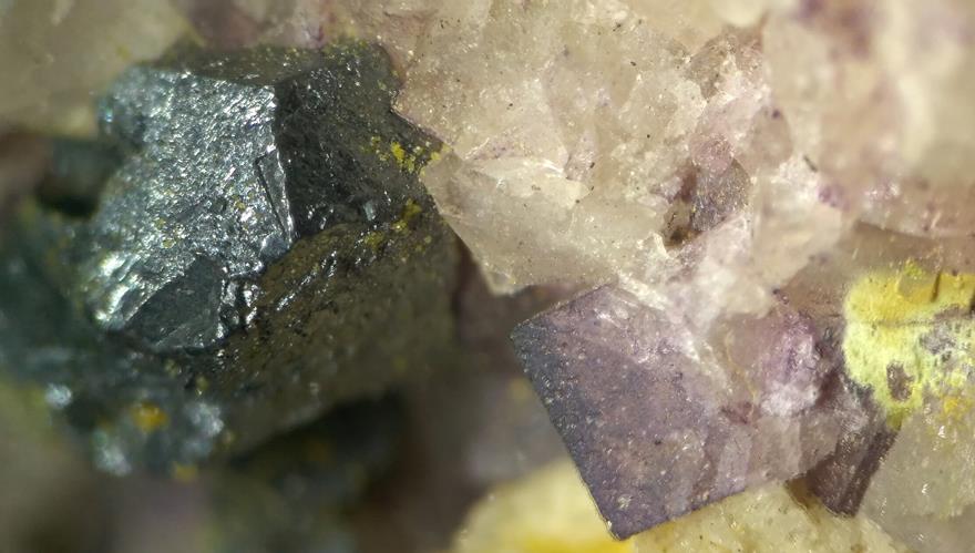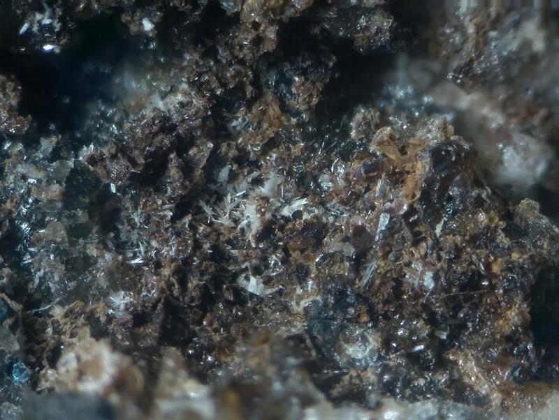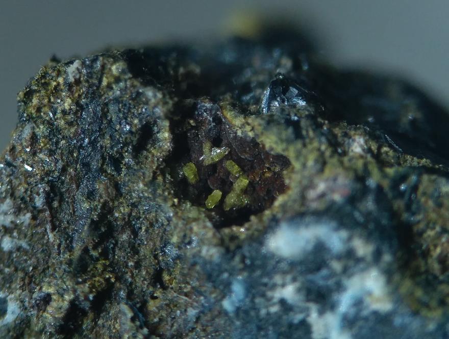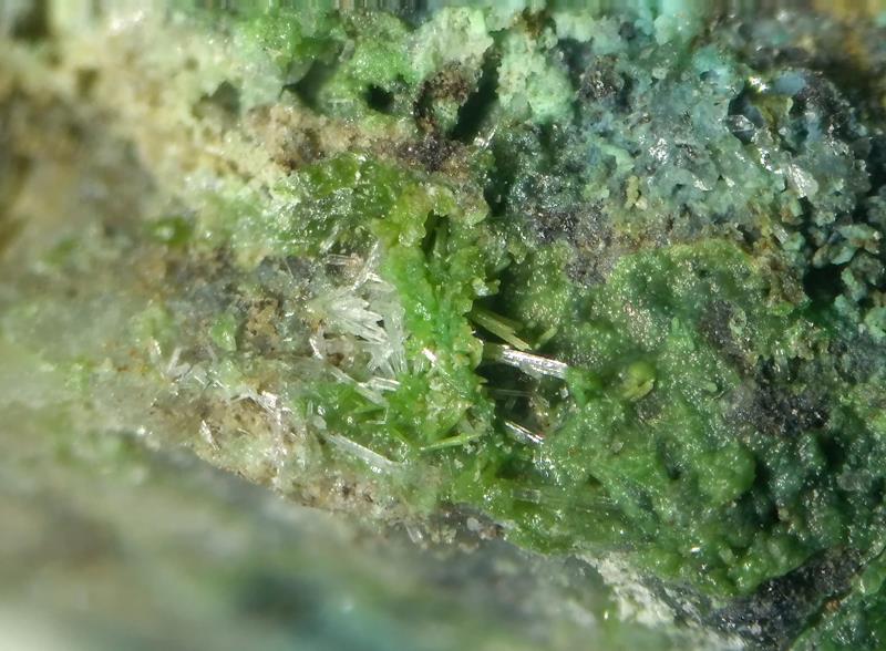 Ja, Mallestigit sind die Prismen. Sehen von der Form her ein bisschen so aus wie kleine Quarze oder Mimetesit. Das grüne Zeug ist entweder Bayldonit oder amorph. Schultenit habe ich von dort auch, sehen aber anders aus. Meist sind es nadelige Aggregate, die so pinselartige Enden haben.
