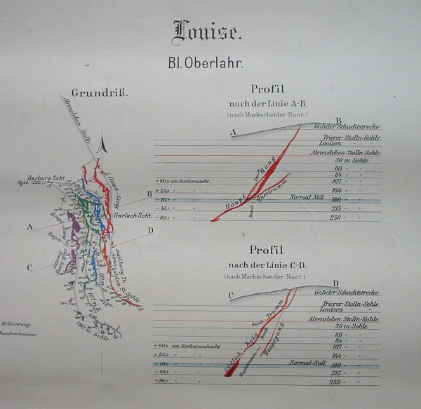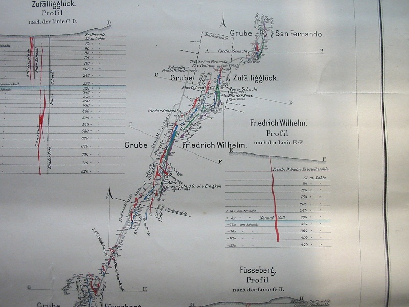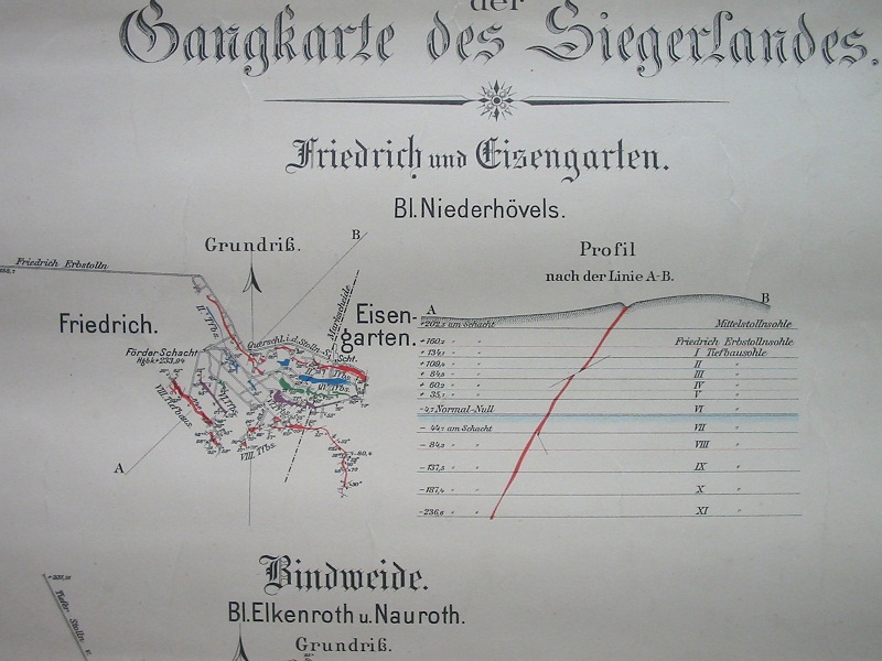Viele Gruben im Siegerland waren Verbundgruben. Mineralstufen aus diesen sind mitunter schwer zuzuordnen. Ein klassisches Beispiel ist die Grube Füsseberg/Friedrich-Wilhelm, die nach Norden hin auch zu San Fernando durchschlug. |