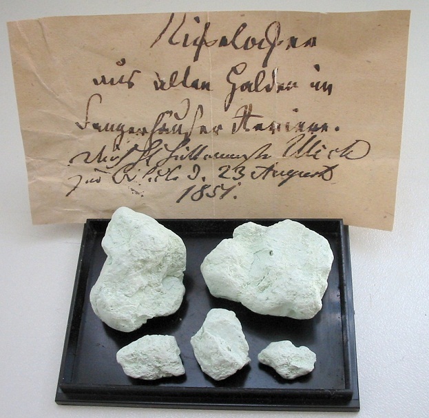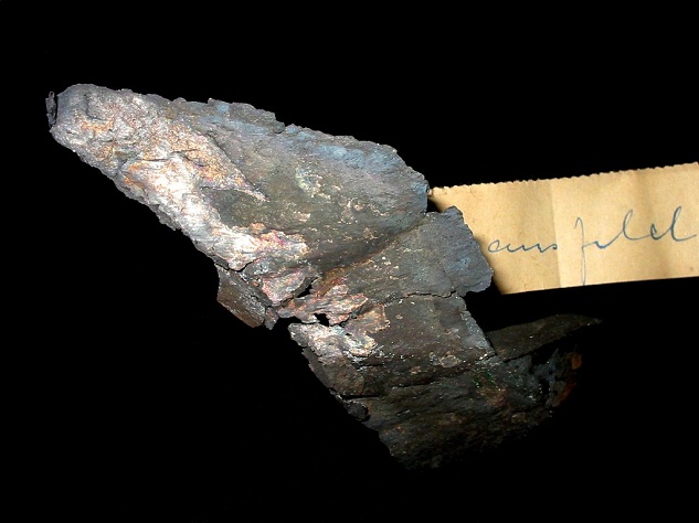 Massiver Cuprit mit Malachit von Eisleben. Sehr seltenes Sekundärmineral aus der Gegend, da die "Huterze" der Oxydationszone bereits früh abgebaut wurden. Mit Etikett (aus dem Jahre 1916) von Fritz Seliger, ein Tausendsassa aus Berlin, der im Au |