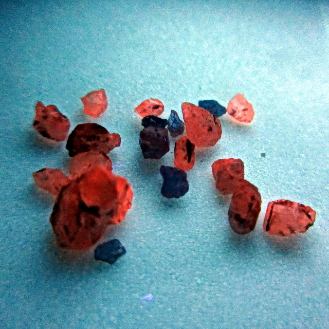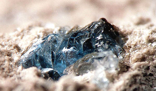 eingebettet im Bims als auch in der basaltischen Lapilli (Auswürflinge). Die im Bims, zum Vergleich mit der basaltischen Lapilli, mehr heller blauen Einschlüsse - bevorzugt auch in idiomorphen Kristallen auftretend - erreichten dabei eher Größen von nur 1-2 mm während die Einschlüsse in der dunkleren basaltischen Lapilli durchaus auch in Größen bis 5 mm von uns vorgefunden wurden; dabei dominierte eher ein dunkelblauer Farbton.