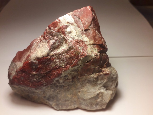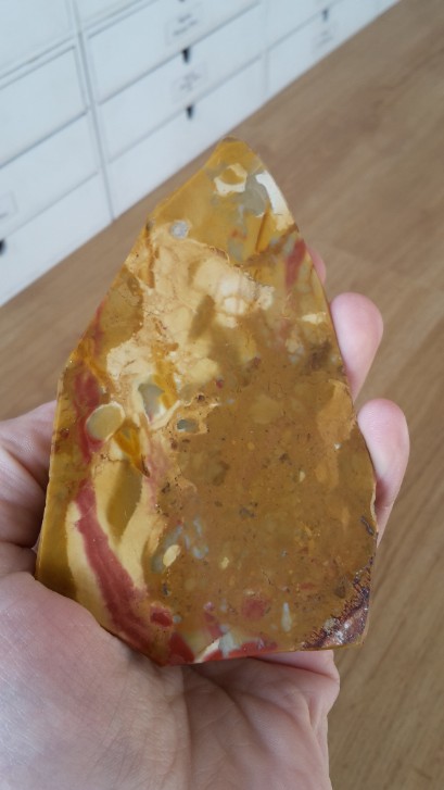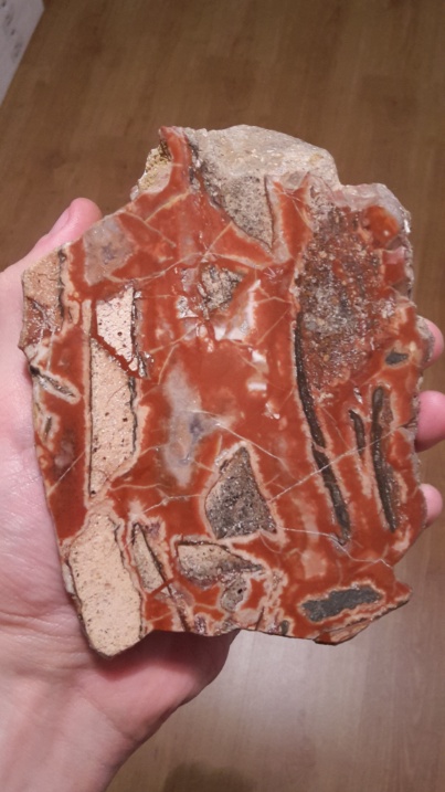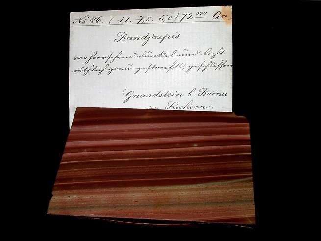 Eigentlich kein "richtiger" Jaspis, sondern ein verkieselter Tuff ist der berühmte "Bandjaspis" von Gnandstein in Sachsen. Hier eine 8,5 cm breite anpolierte Platte mit altem Etikett.