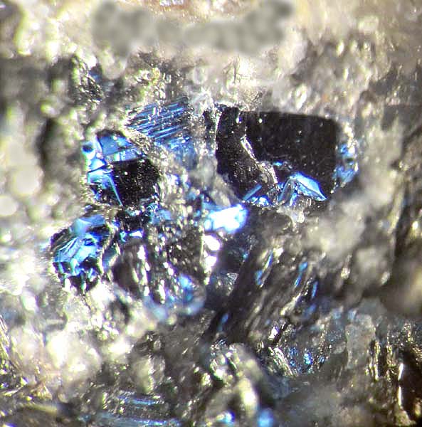Mikroskop-Aufnahme, Bildbreite 4 mm, z.T. hellblau metallisch glänzend bzw. irisierend |