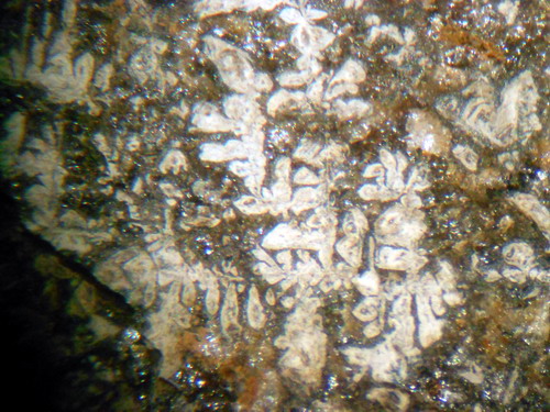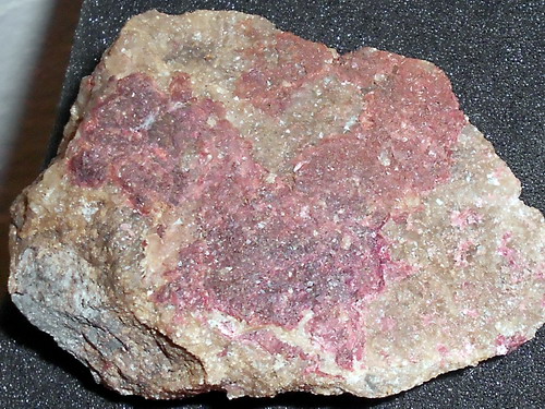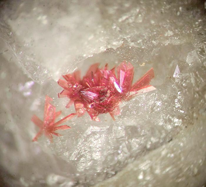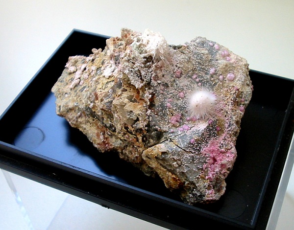 Pikropharmakolith-Igel mit winzigen, weißen Pharmakolithkügelchen und rosa Sainfeldit von der Grube Daniel. |