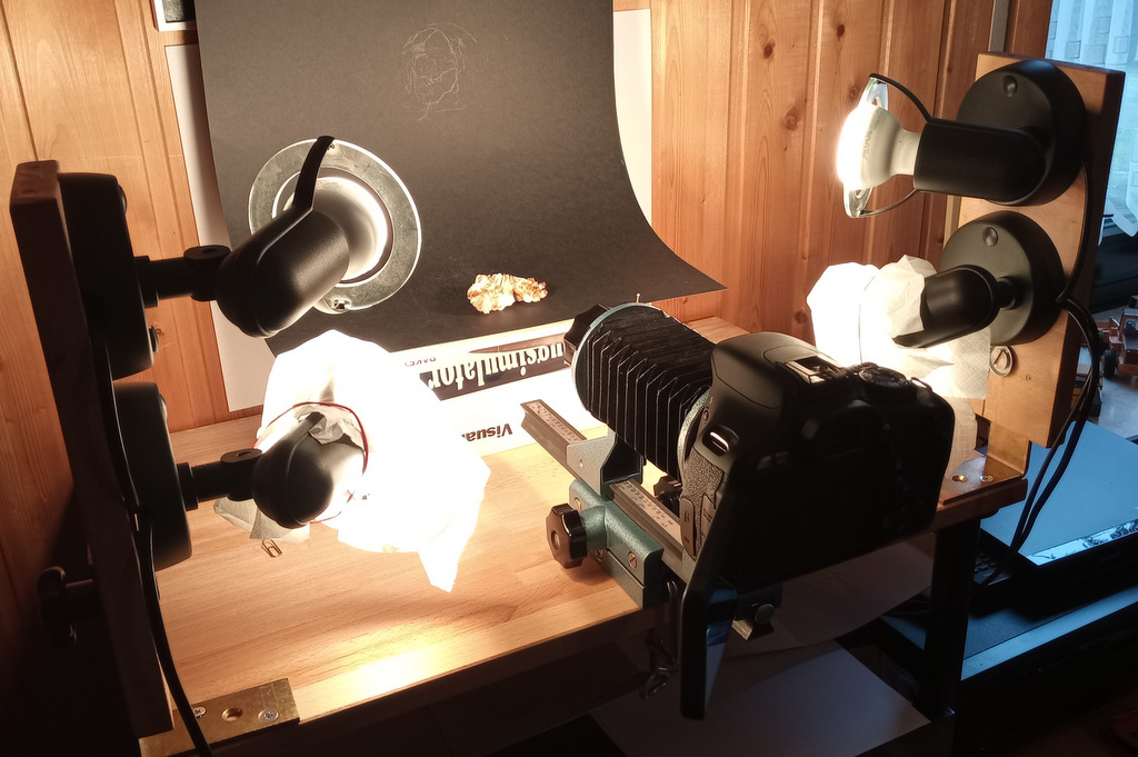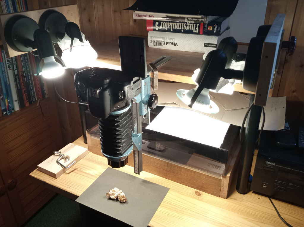Bild1 zeigt die Einrichtung für horizontale Fotografie, damit erreiche ich Vergrößerungen von 0,5 bis 8, bezogen auf die Sensorgröße. Die Einrichtung besteht aus Vergrößerer-Objektiv (80mm oder 105mm), Balgengerät (Pentakon) für M42, Adapter von M42 auf EF-Bajonett, Canon EOS 600D.