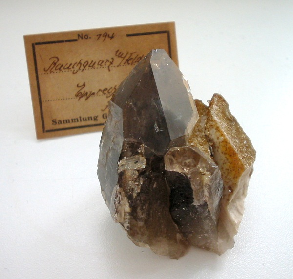 | Information: | 5 cm hoher Rauchquarzkristall an Mikroklin vom Epprechtstein. Älterer Fund aus den 1930er Jahren. |
