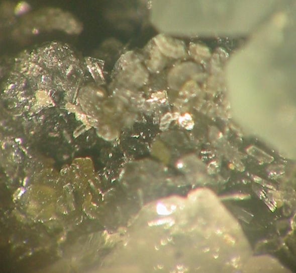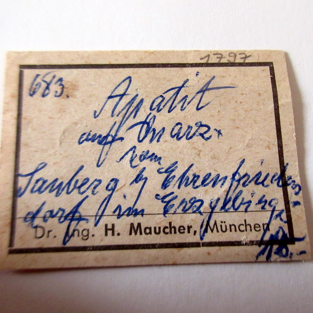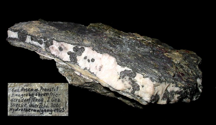 Massiver Nickelin mit Nickel-Skutterudit, Rammelsbergit und Wismut in Quarz aus einem historischen Fund im Feld Kleine Vierung. Auf dem etwa 4,5 cm breiten Stüfchen konnte ich in zwei winzigen Hohlräumen auch goldene Milleritnädelchen entdecken, ein Miner |