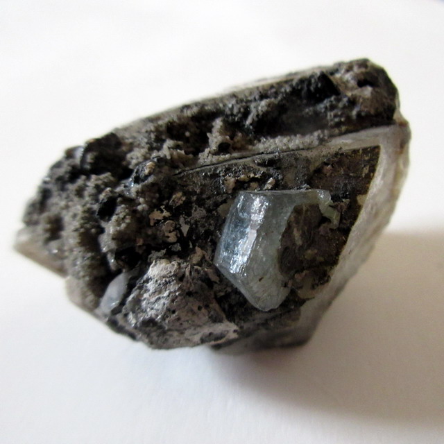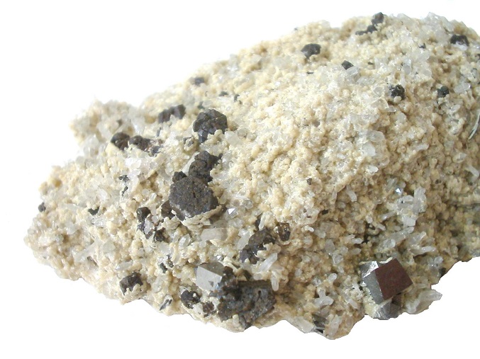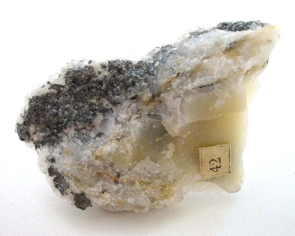Derbe Einschlüsse von Tetraedrit in Quarz. 4 cm breite Stufe aus dem Querschlag 6032W, 6. Sohle, Westfeld. |