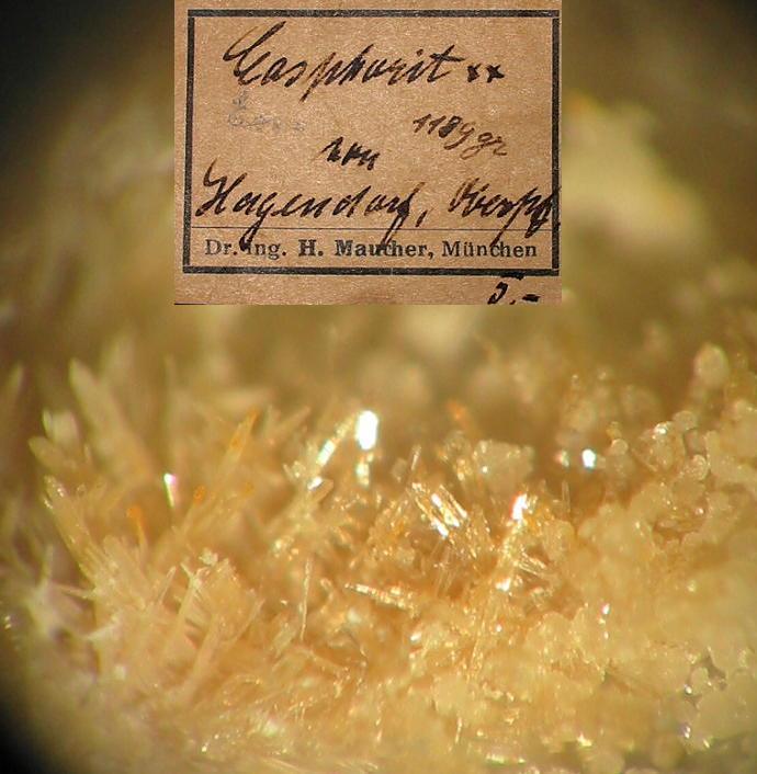 Rosagelbliche Eosphorit xx von Hagendorf. Dem Etikett nach um 1950 gefunden, was durchaus interessant ist. Es dürfte sich durchaus um einen Fund von Hagendorf-Süd handeln, allerdings aus den oberen Teufen, als hier die ersten Sekundärphosphate auftauchten.