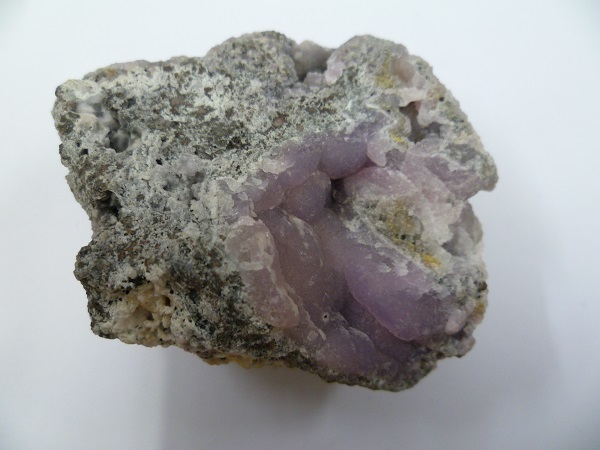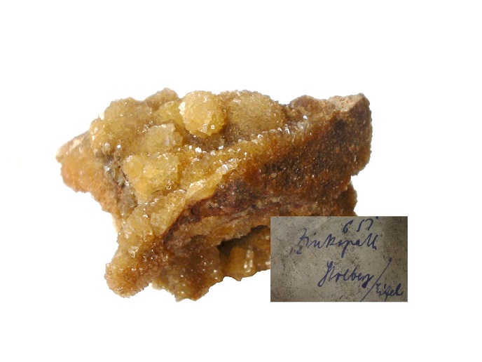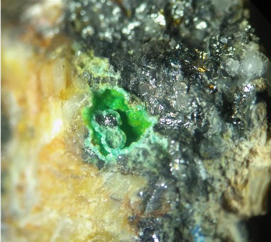 Grüner krustiger Smithsonit neben nicht genauer identifizierten Erzmineralien von der Halde der Grube Silbersand in der Eifel. Das Stück wurde ursprünglich als ein Kupfermineral angesprochen, zumal Smithsonit in der offiziellen Mineralienliste bislang fehlt. Nach der EDX-Analyse stellte sich das Material aber als Blei-und Kupfer-haltiger Smithsonit heraus.