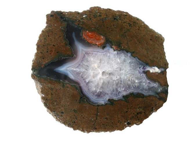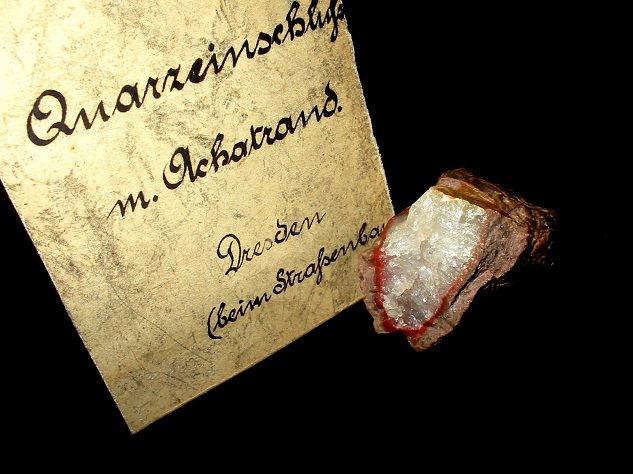 Kleinstufe mit Quarzdruse, die mit einem roten Achatband umrandet ist. Gefunden um 1900 beim Straßenbau in Dresden. Historisches, knapp 3,5 cm breites Stück aus der Sammlung Quaas/Dresden.