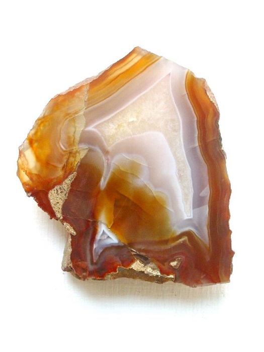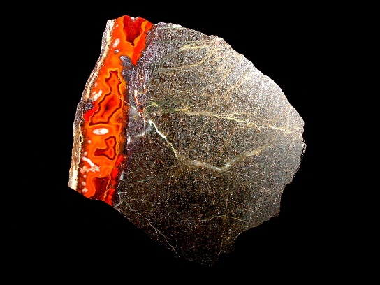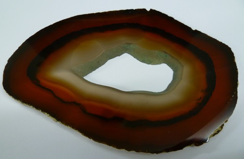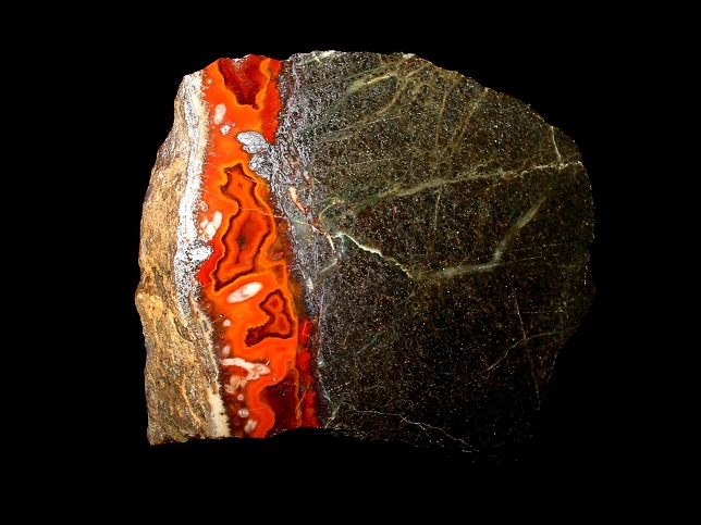 Achat von Hartmannsdorf in Sachsen - das sind zwei Möglichkeiten. Einmal die bekannten Achate aus dem Osterzgebirge, aber es gab auch Achat im Pyroxengranulit des Ratsbruches bei Hartmannsdorf im Granulitgebirge. Von dort sind herrliche, feuerrote Brokatachate bekannt. Abgebildet ein rund 6 cm breites Exemplar vom Ratsbruch.