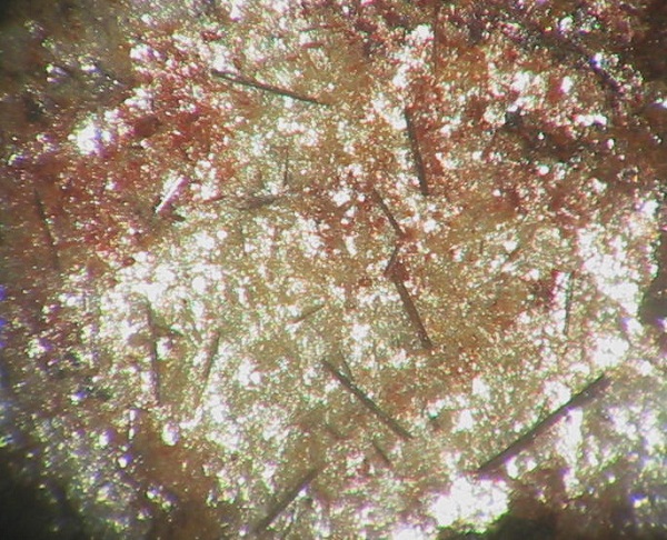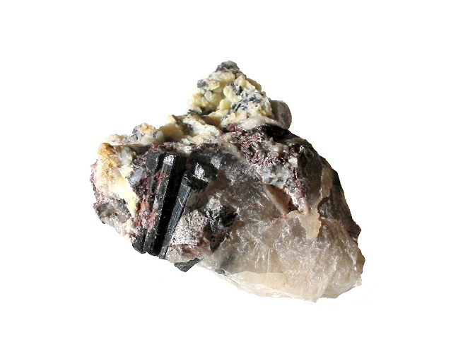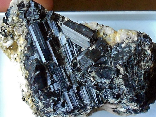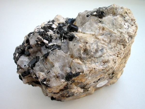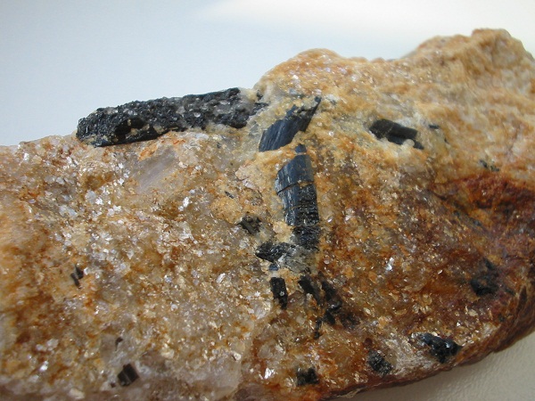 Und noch ein kurioses Stück, das in den Abrisstrümmern des alten Erbrichterhauses in Himmelsfürst bei Brand-Erbisdorf/Erzgebirge gefunden wurde. Früher hatten alle bedeutenden Grundstücke einen eigenen kleinen Werksteinbruch, so auch das Erbrichterhaus. Dieses wurde im 16. oder 17. Jahrhundert errichtet, ich weiß es nicht mehr genau. Vor einigen Jahren wurde das baufällige Anwesen abgerissen und in den Trümmern fanden sich hie und da pegmatitische Schlieren mit hübschen Schörl xx. Die eigentliche Fundstelle war seit mehreren 100 Jahren überbaut, doch nun konnte man noch einmal etwas davon bekommen. Das Stück habe ich selbst auf einer Schutthalde in Brand-Erbisdorf gefunden. Der längste Kristall hat etwa 3 cm.