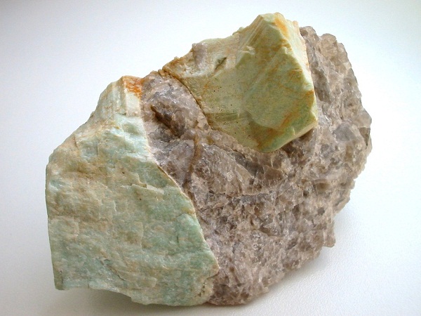 Amazonit wäre nun nicht das erste, was einem zu deutschen Feldspäten einfällt. Hier ein Stück mit 4 cm Zwilling von Hilbersdorf in der Oberlausitz. |