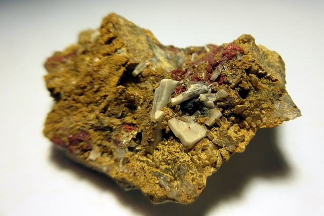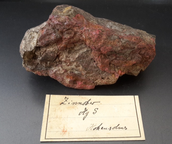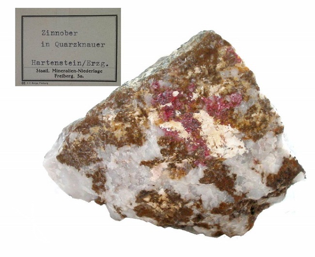 Cinnabarit als etwa 6,5 cm breites Reicherzgangstück vom Samuelisstolln im Tieftal bei Hartenstein/Erzgebirge. Dieses uralte Quecksilberbergwerk wurde letztmalig zur Zeit des Zweiten Weltkrieges betrieben, im Rahmen der Autarkiebestrebungen des Dritten Reiches.