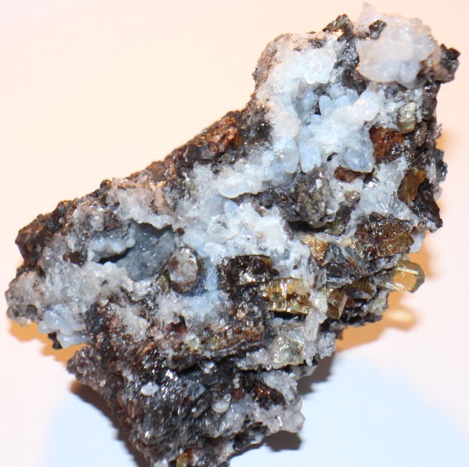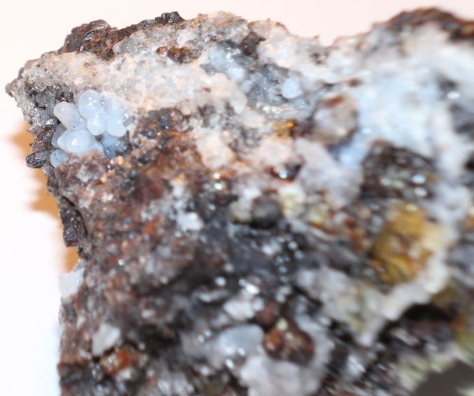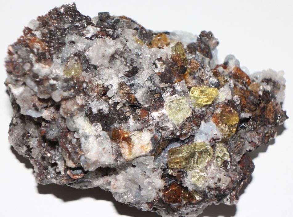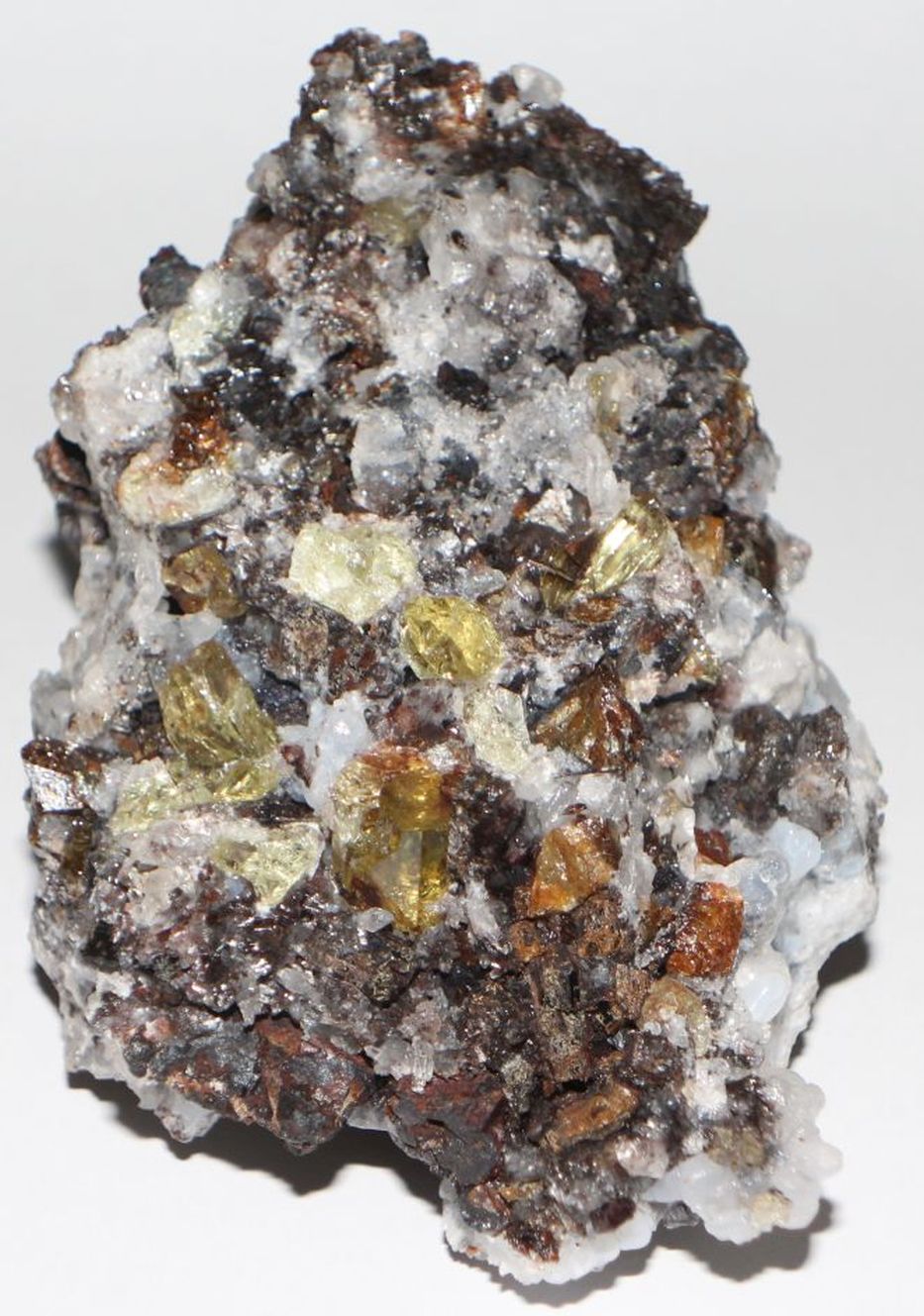 Sphalerit: Ein Zinksulfidmineral, Sphalerit kann eine Reihe von Farben aufweisen, einschließlich Gelb, Braun, Rot und Schwarz. Es bildet sich oft als kleine, abgerundete Kristalle innerhalb des Witches Fingerquarz.