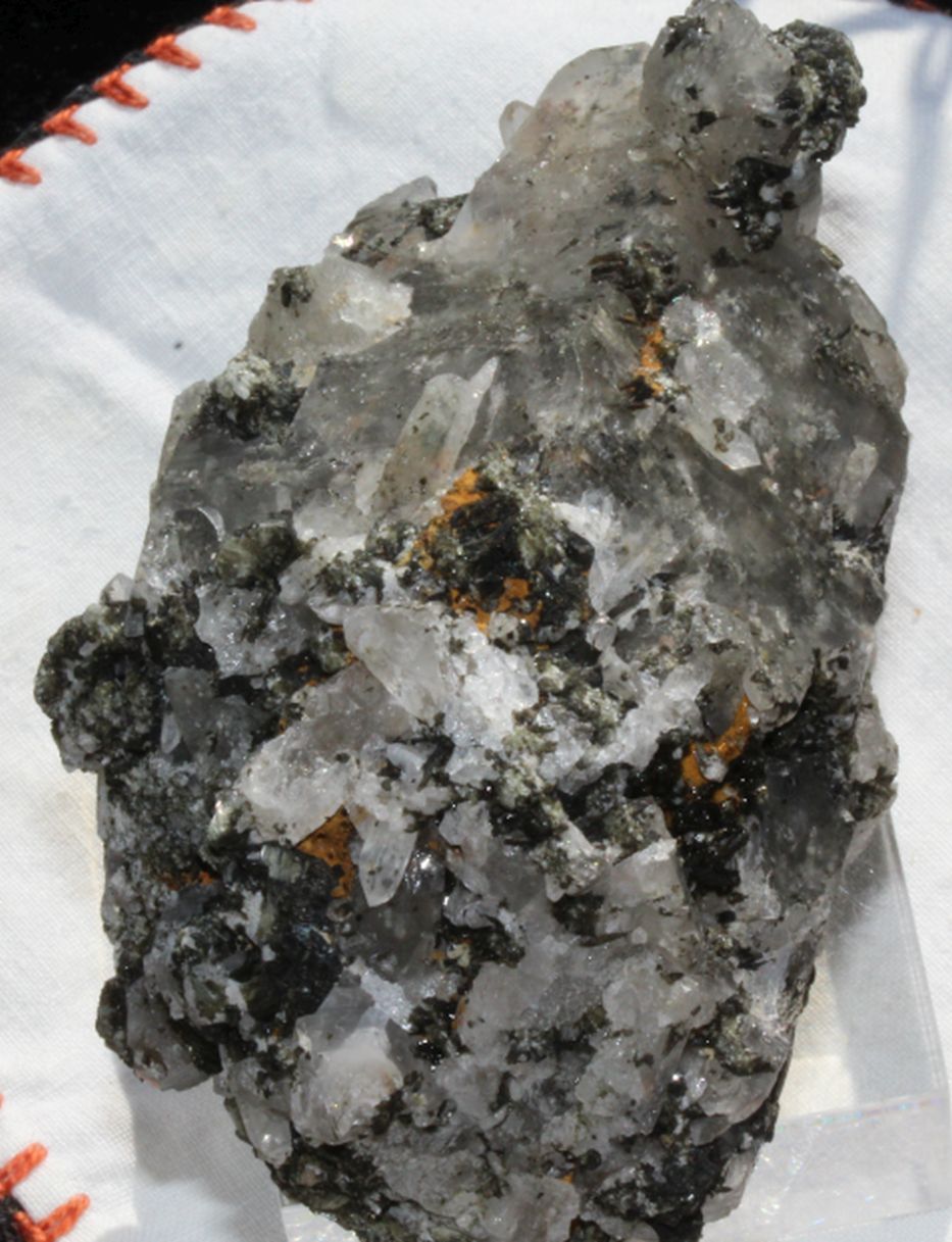 Magnetit: Dieses Eisenoxidmineral ist bekannt für seine starken magnetischen Eigenschaften. Magnetit erscheint oft als schwarze oder dunkelbraune Kristalle im Hexen-Fingerquarz.
