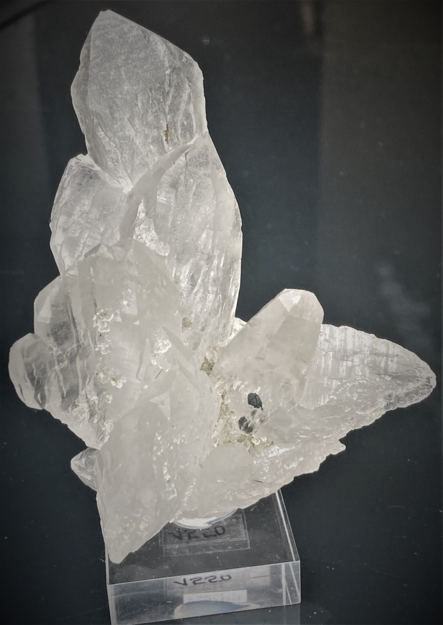 Eine Schwimmerstufe aus stark verzerrten Quarzkristallen in deren Mitte ein einzelner Quarz im Tessiner Habitus steht.