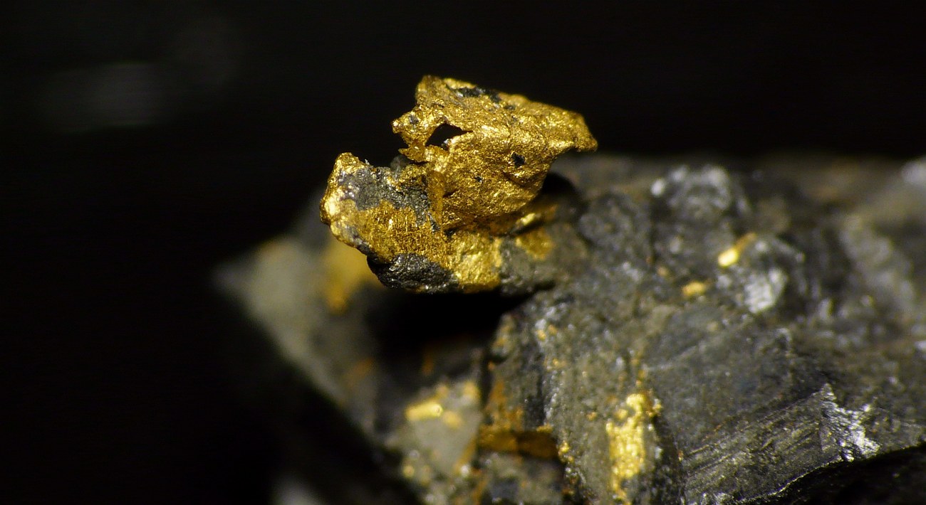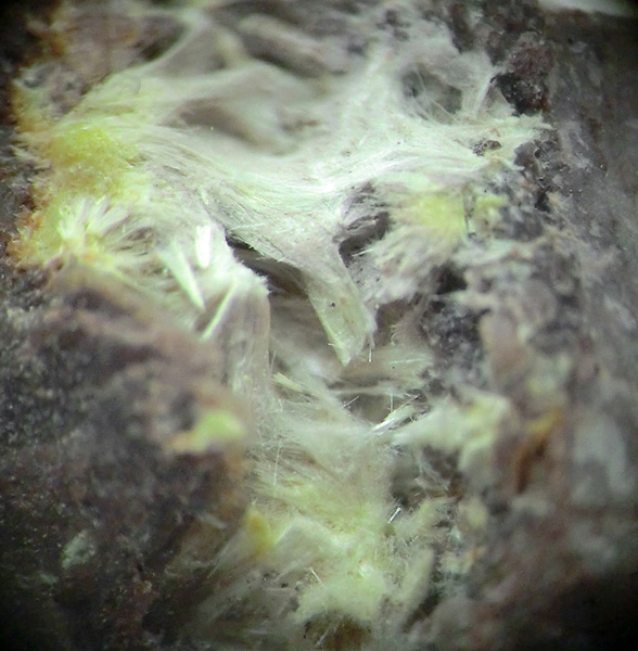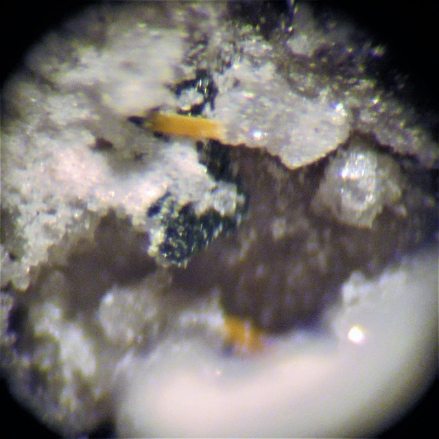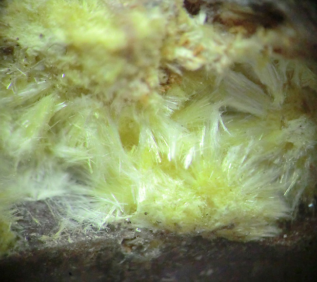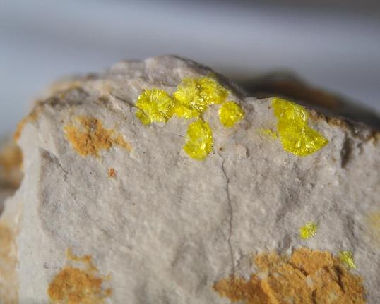 Dunkelgelber blättriger Larisait verwachsen mit Haynesit (etwas heller und opak) auf Klüften eines jurassischen Sedimentgesteins |