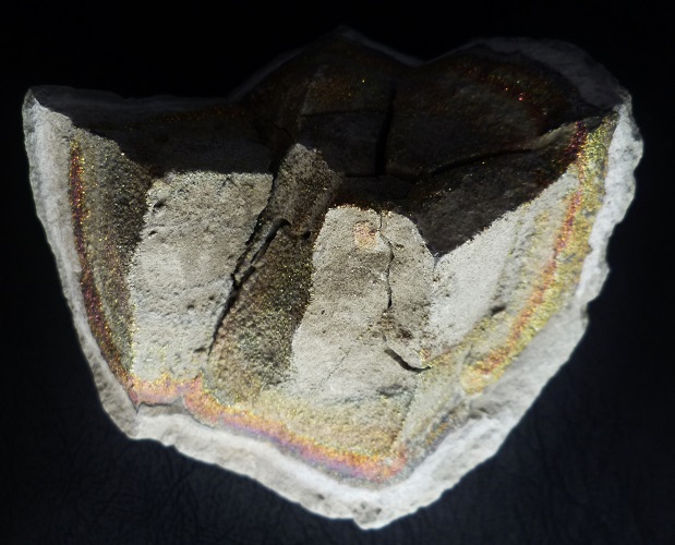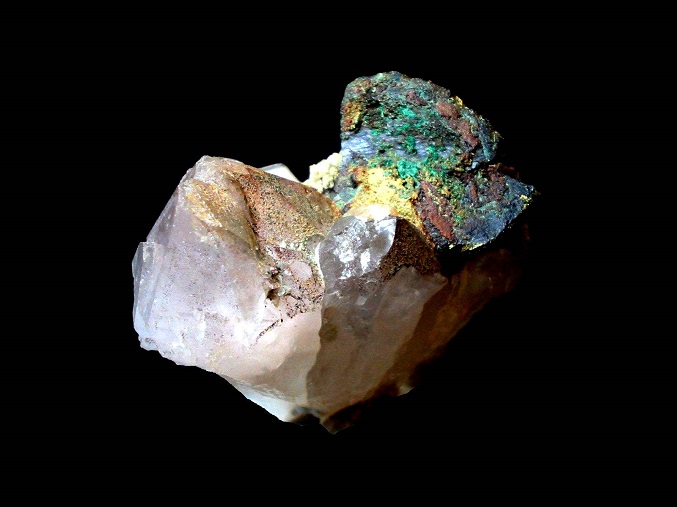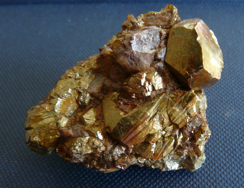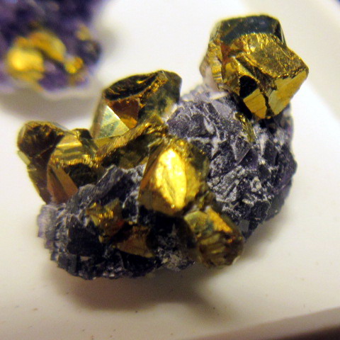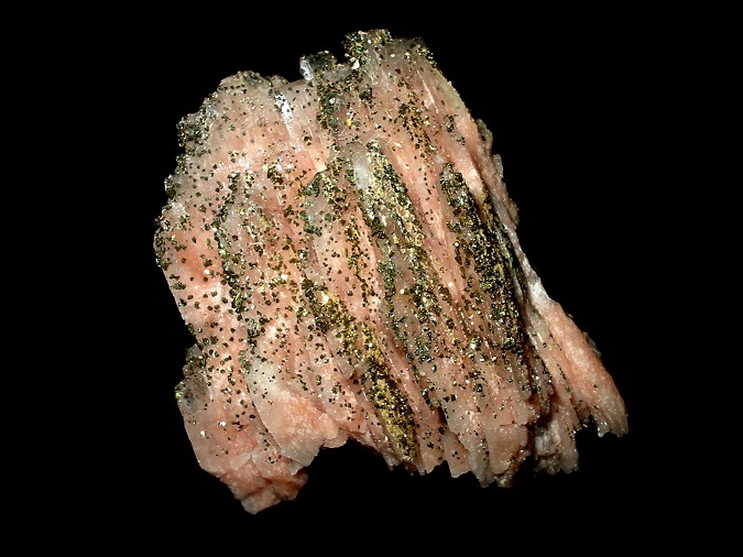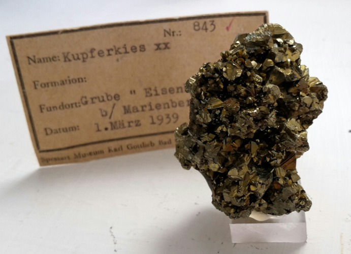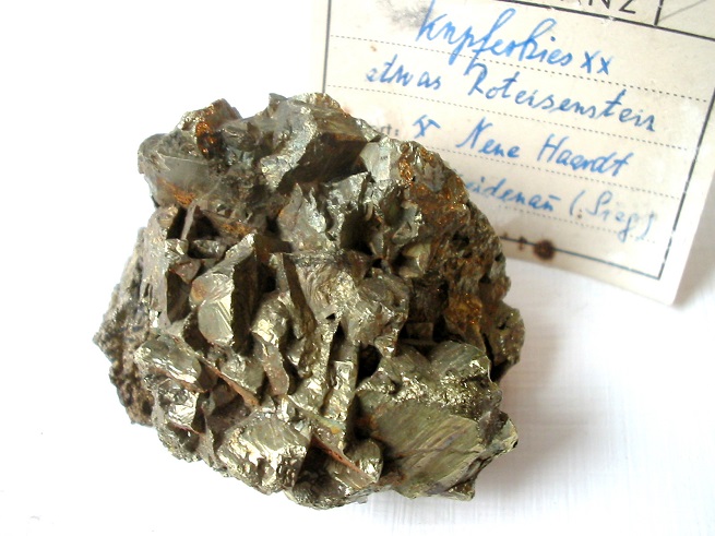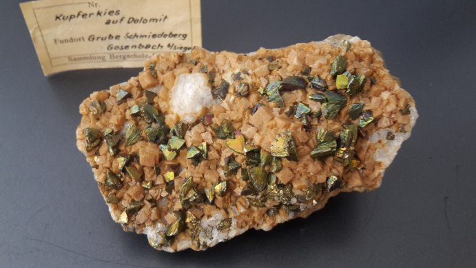 Chalkopyrit xx auf rosa Baryt-Fächer von der Grube Bäuerin, Annaberg, Erzgebirge. Etwa 7,5 cm hohes Exemplar aus einem einige Jahre zurückliegenden Fund. Ursprünglich saßen die Fächer immer auf rötlichgrünen Fluoriten, sind aber nahezu immer von der Matrix abgefallen. Besonders Stücke "mit Unterlage" sind begehrt und - persönlich gesprochen - maßlos überteuert...