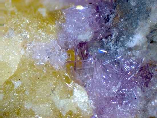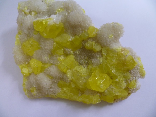Als Anfang mal eine ungewöhnliche Paragenese aus der Schwefel-Lagerstätte Vodinskoe (bekannt für idiomorphe Schwefelkristalle in bitumengefüllte Drusen):
