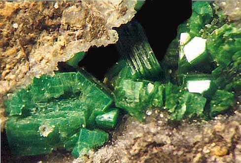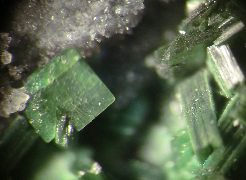 Jedenfalls sieht es in der Tat nach einem Zeunerit-oder Torbernit-ähnlichen Mineral aus, .. ist aber ein wasserhaltiges Calcium-Vanadium-Phosphat ohne Uran o.ä. Elemente.