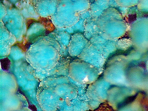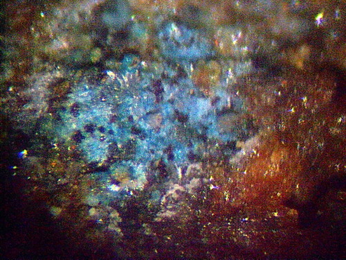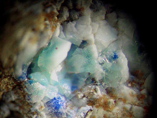 Mikroskop-Aufnahme, Bildbreite 6 mm - Serpierit xx blau, Zincowoodwardit massiv weiß |
