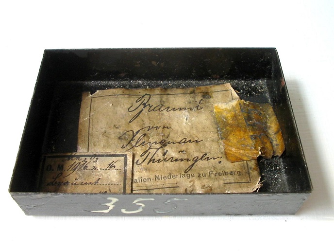 Braunit xx von Öhrenstock bei Ilmenau in Thüringen. Etwa 7,5 cm breite Stufe mit Metallschachtel, in die im Jahre 1916 einige Etiketten eingeklebt wurden.