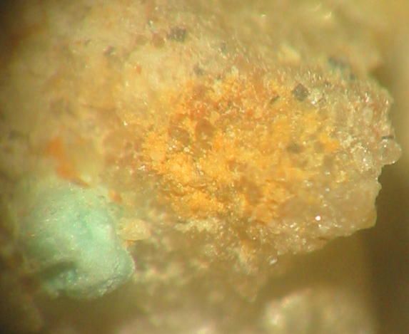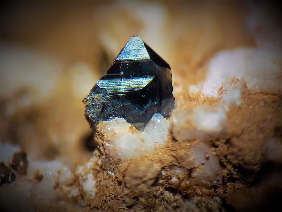 Winzige blauschwarze Anatas-Täfelchen mit Malachit vom Schmiedestollen bei Wittichen im Schwarzwald. Ein durchaus ungewöhnliches Mineral für diesen Fundort... |