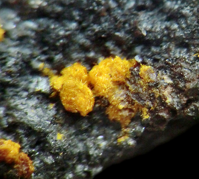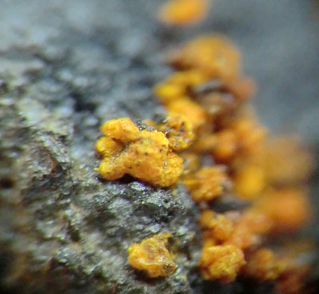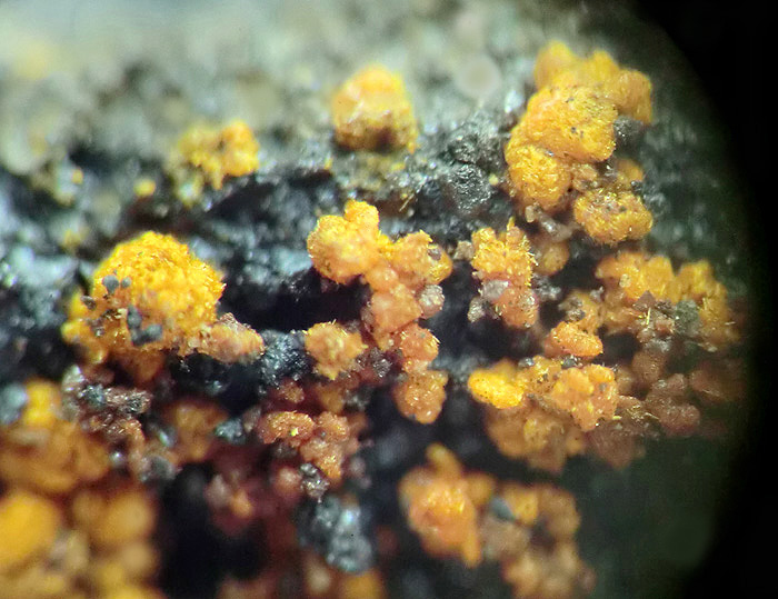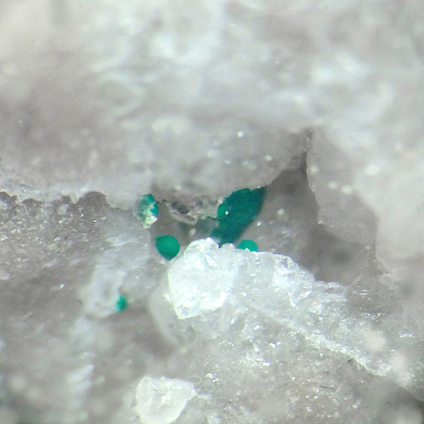 Eurekadumpit xx als blaugrüne Kügelchen in Gesteinhohlraum ..