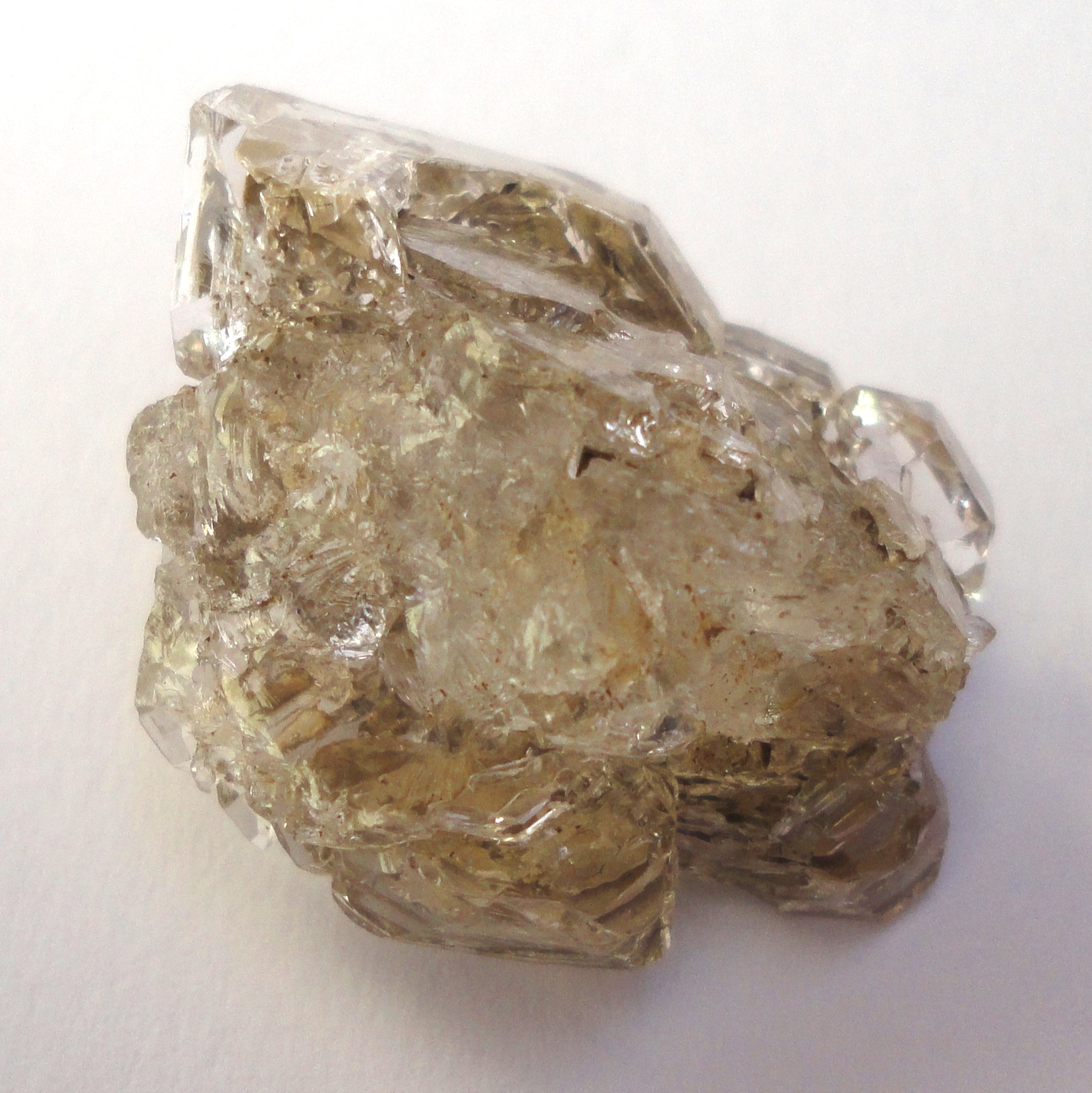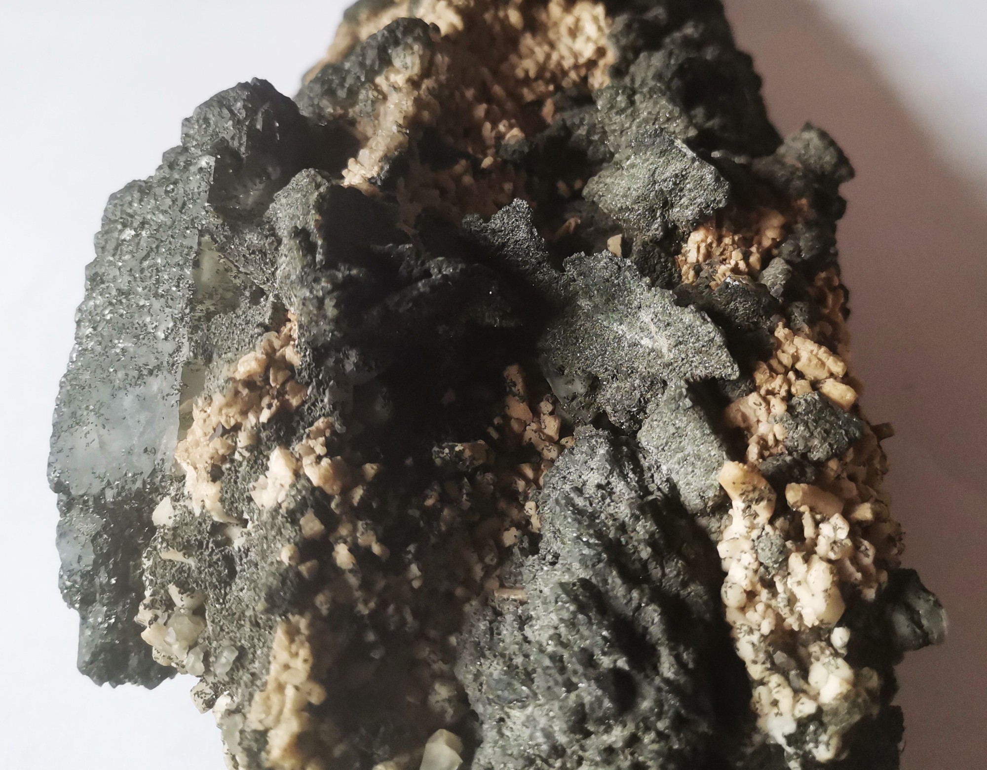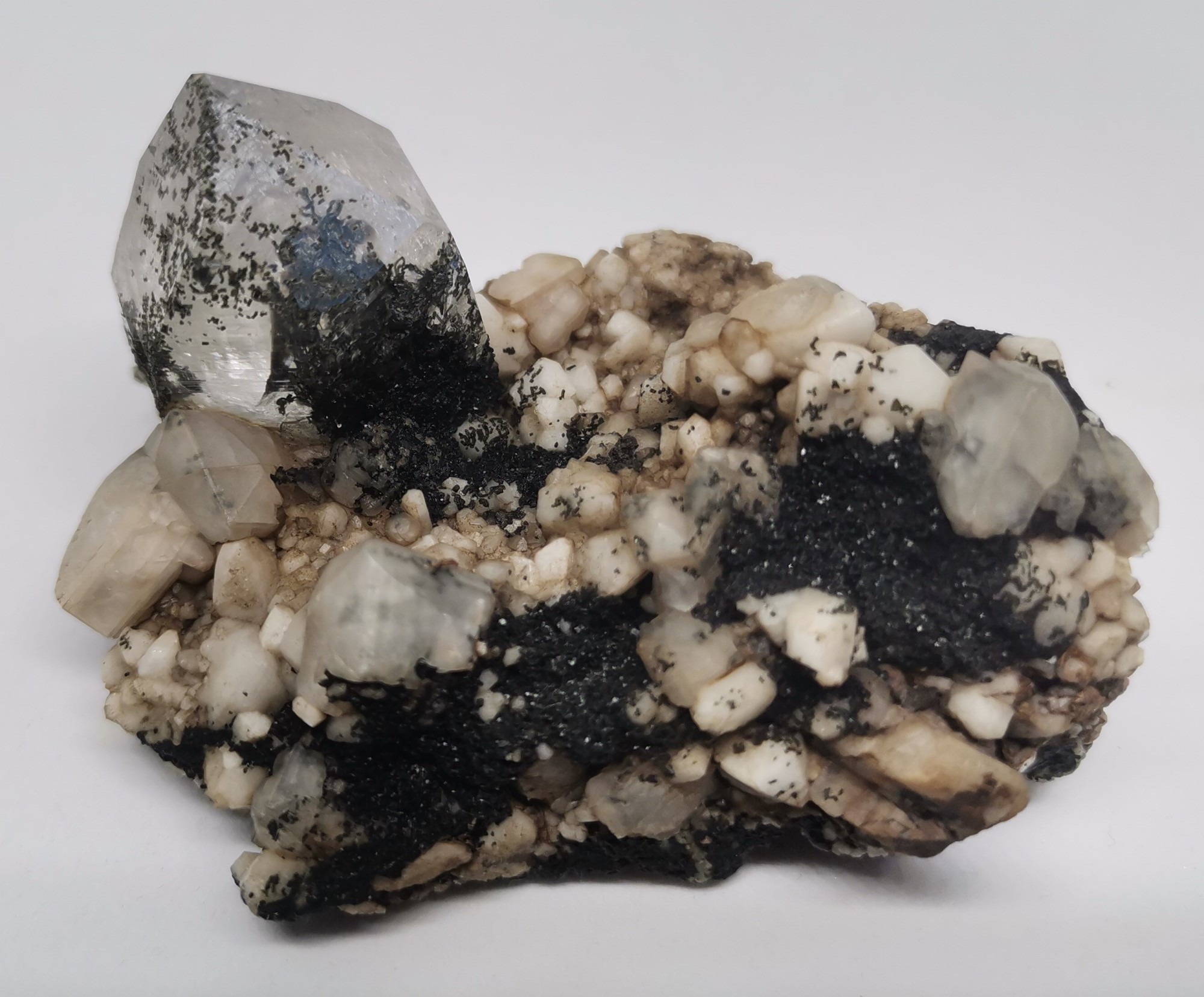 Ein in der Kluft abgefallener Quarz (Bergkristall), komplett Chlorit-durchwachsen, überzogen mit Adular und relativ großen blätterförmigen Titanit-Kristallen, ebenfalls Chlorit-ummantelt.