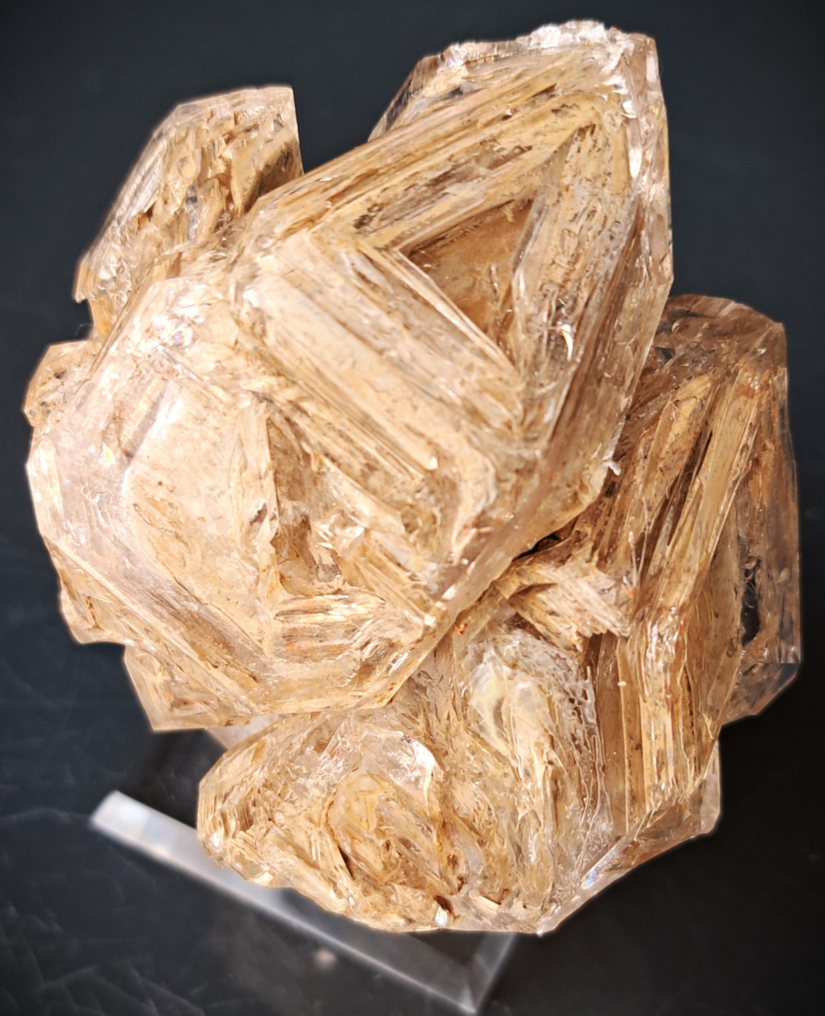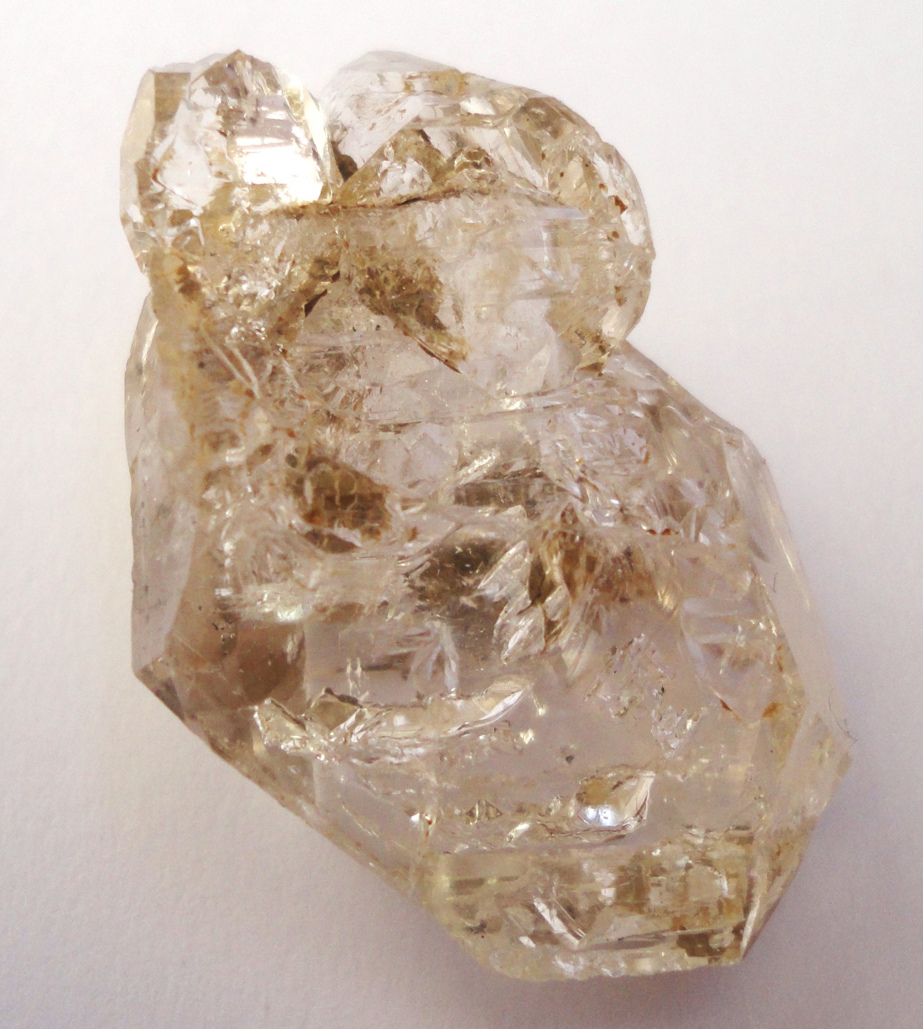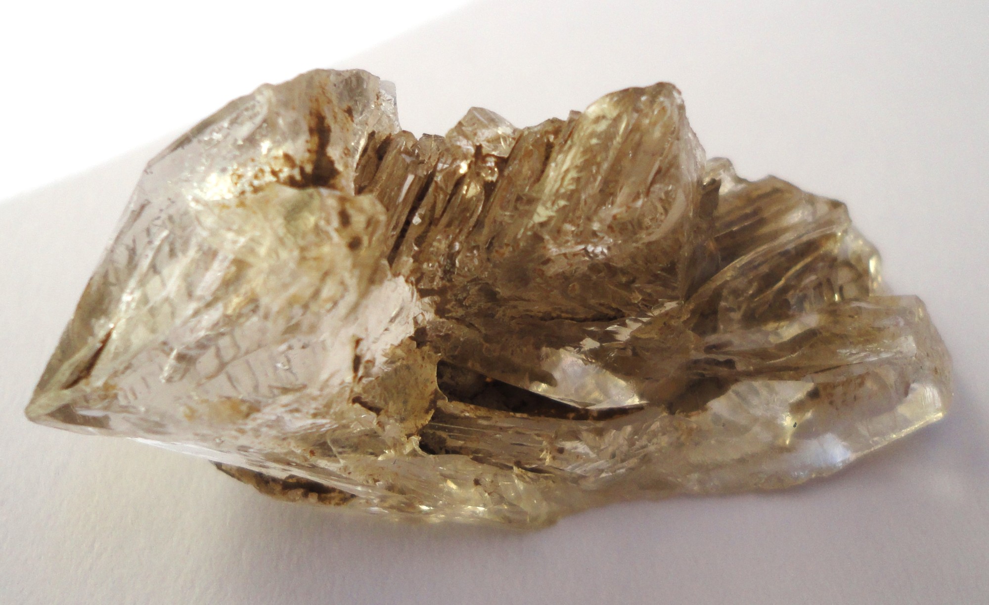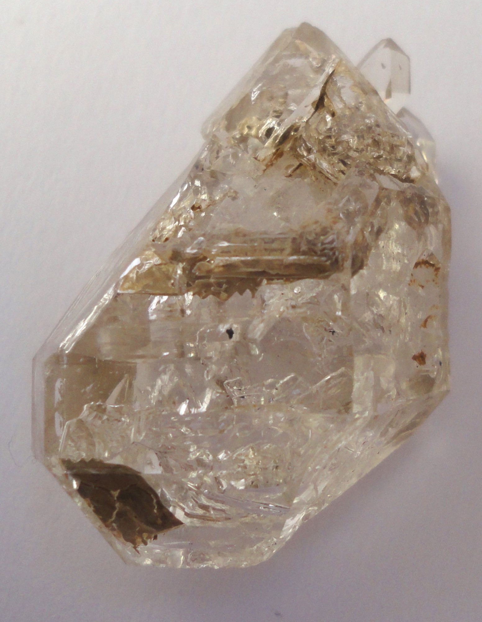 Ein in der Kluft abgefallener Quarz (Bergkristall), komplett Chlorit-durchwachsen, überzogen mit Adular und relativ großen blätterförmigen Titanit-Kristallen, ebenfalls Chlorit-ummantelt.