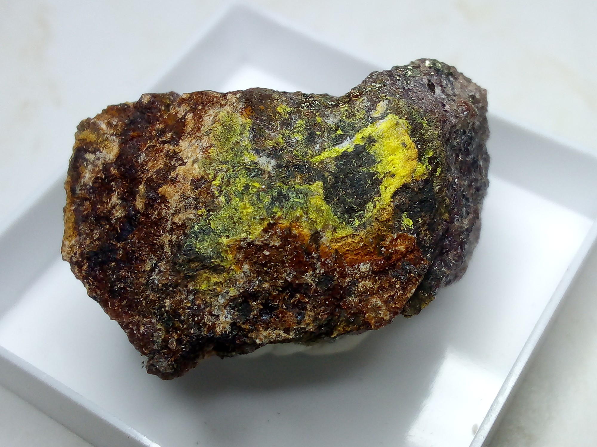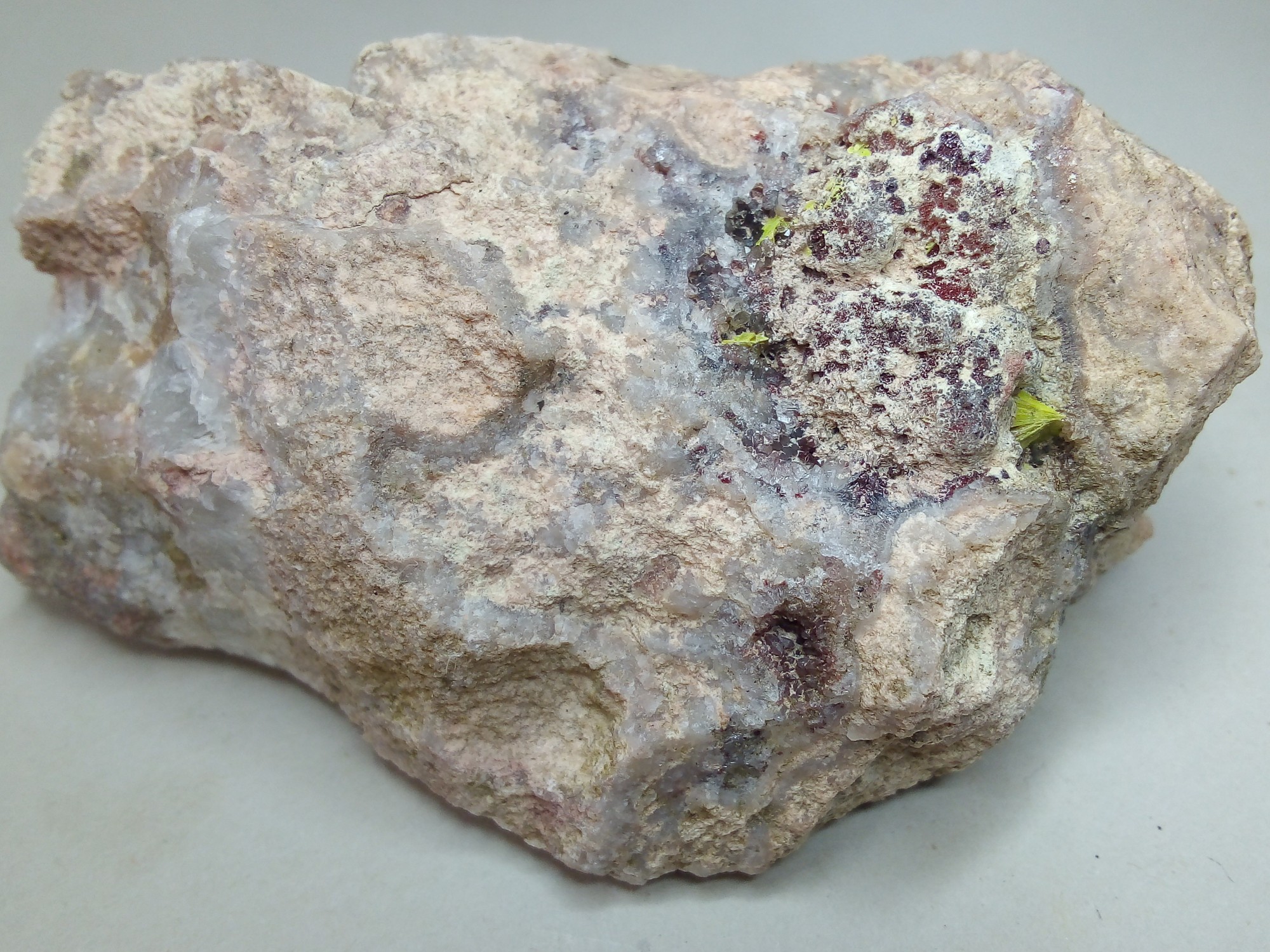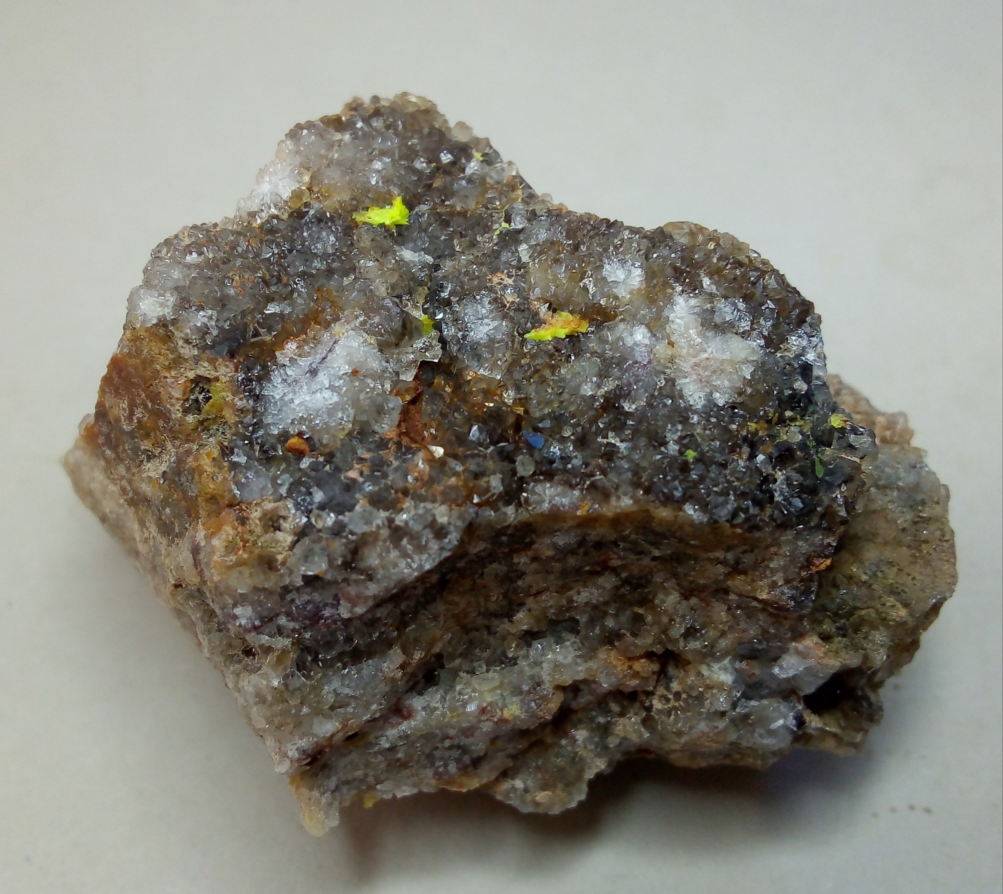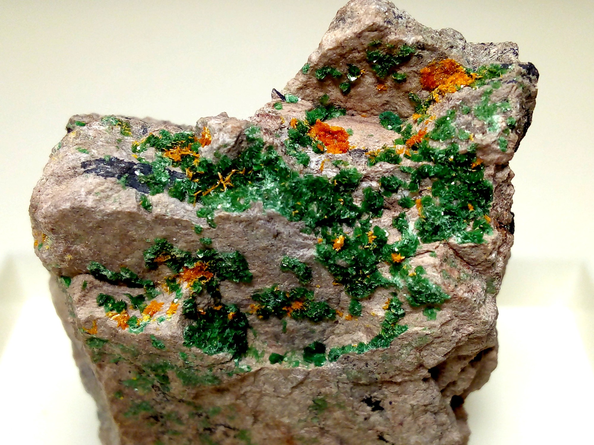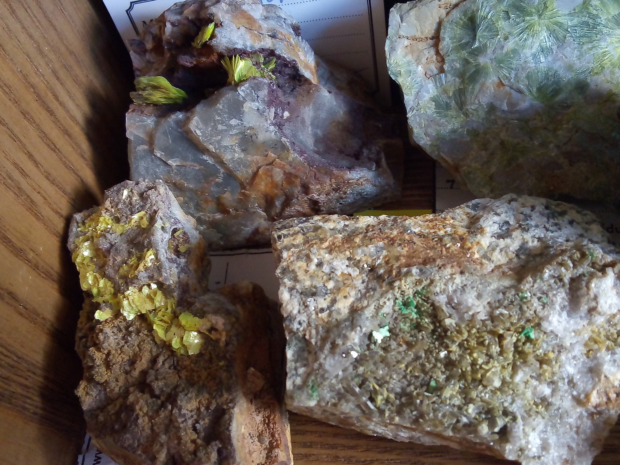 von hinten nach vorne: Autunit - CZ, Uranocircit - Streuberg, Torbernit auf Quarz - Henneberg. |