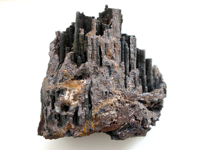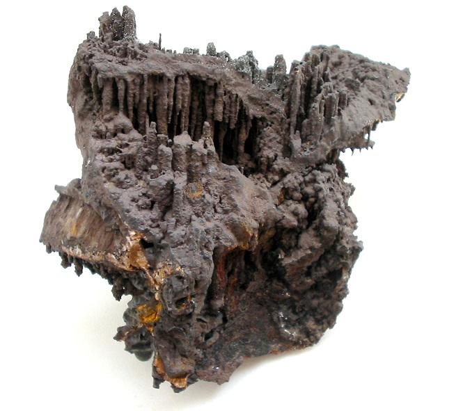 Filigrane "Tropfsteinhöhle" aus Limonit, überzogen mit "Wad" und Pyrolusit von der Grube Dachs bei Dermbach. |