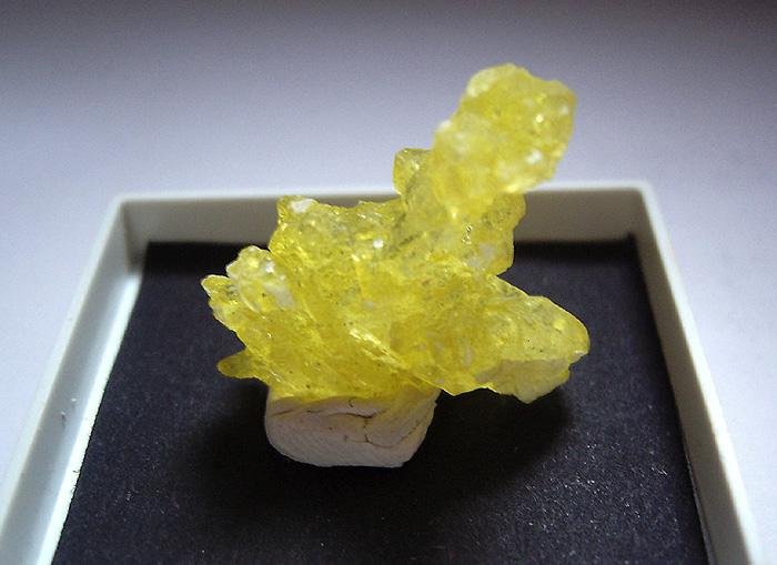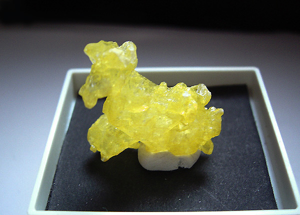 Von Ettringit oder Sturmanit kennt man die gut ausgebildeten Kristalle, beim Sturmanit überwiegen taflig-diskusförmige, mehr dunkelgelbe bis bräunlichgelbe, auch braune xx. Einige der in Mindat abgebildeten heller sattgelben und prismatisch-säuligen Kristalle halte ich für typischen Ettringit und nicht für Sturmanit .. es kann natürlich dabei auch Mischkristallbildung vorliegen.