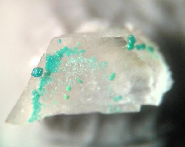 Malachit,Azurit,Cornwallit,Kupferkies,Covellin,Pyrit,Connelit? auf Fluorit und