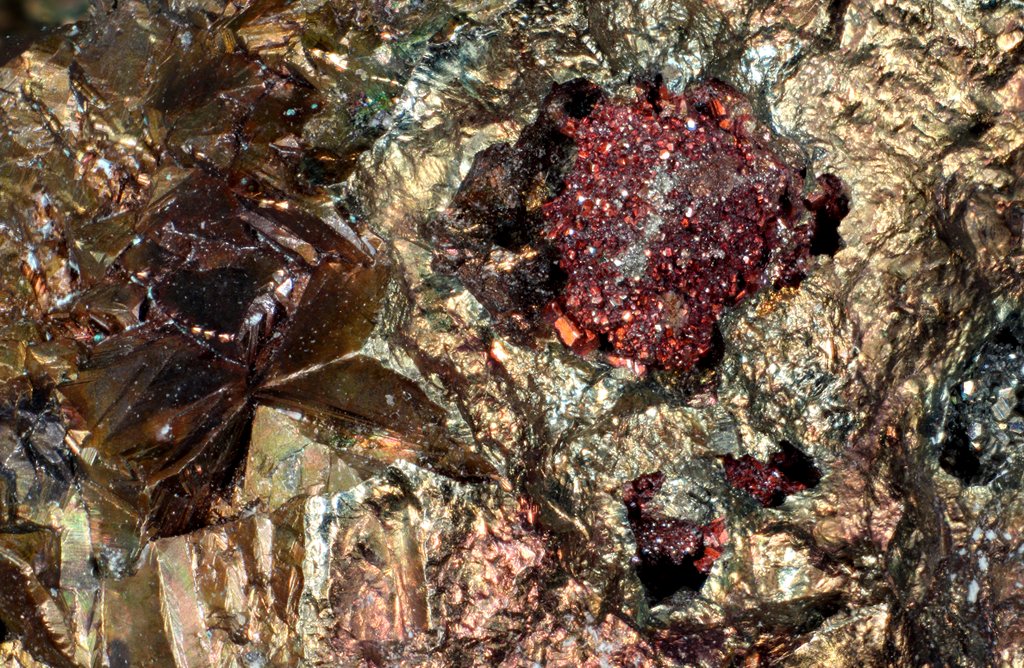 Die Bilder 1 und 2 zeigen (rechts oben) einen roten traubigen Einschluss, der sich optisch vollkommen von dem Kupferkies absetzt. Was kann das sein?
