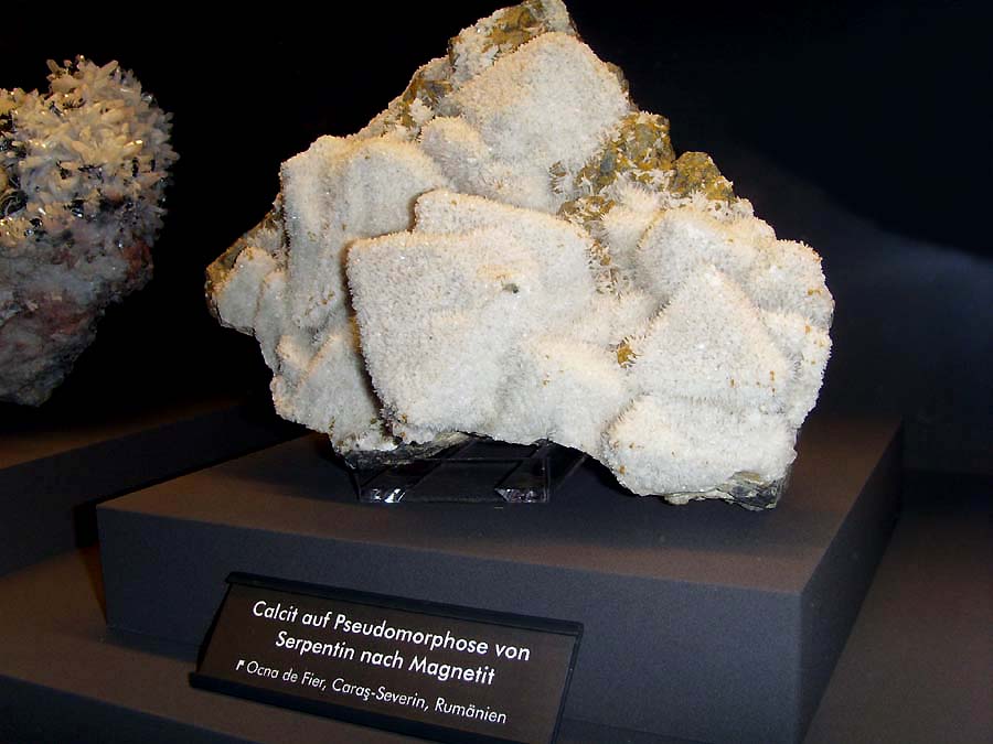 Man sieht natürlich auf dem letzten Bild primär eigentlich nur den weißen Calcit, der die eigentliche Pseudomorphose darunter "überzuckert". .. nur im hinteren Teil der Stufe erkent man dann wohl orangebraunen Serpentin in tafliger Form des ehemaligen Minerals Magnetit.