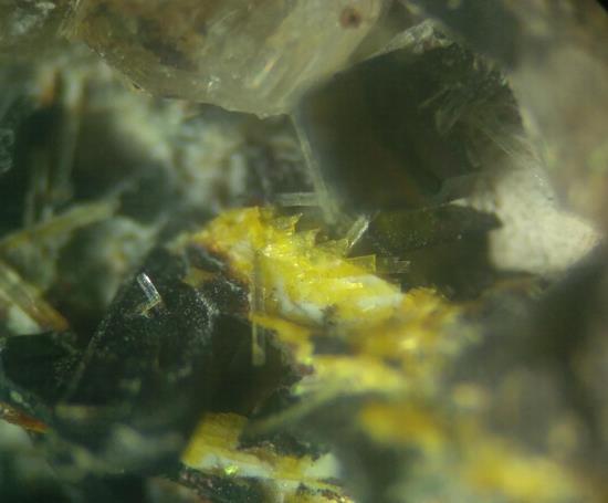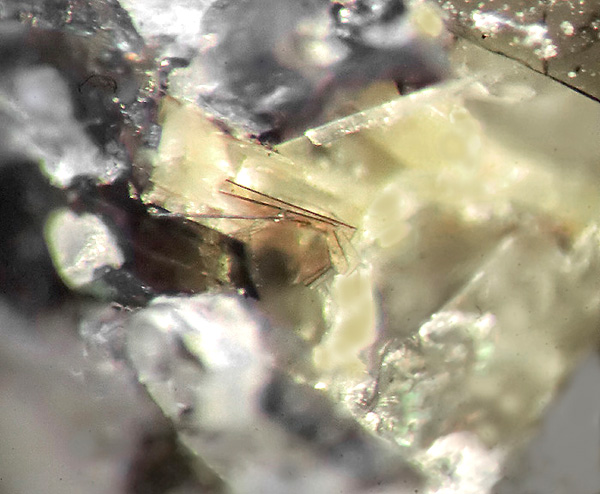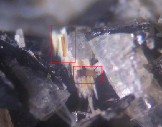 .. siehe jeweils Bildmitte .. mehrere nebeneinander angeordnete, bräunliche Emmerichit-Täfelchen thronen über größeren fbl.-weißen Günterblassit-Tafeln!