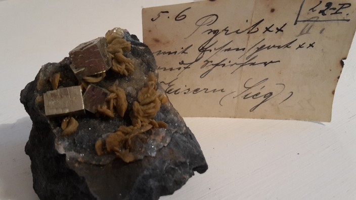 Gleich noch ein Pyrit, einer meiner besten nunmehr. Das Stück stammt von Eisern im Siegerland. Die xx messen etwa 15 mm und werden von Quarz und Siderit begleitet.