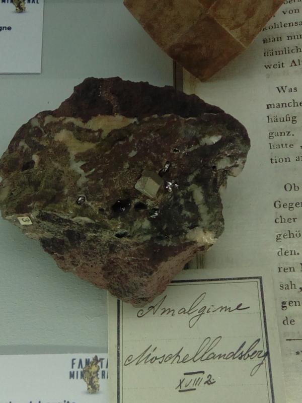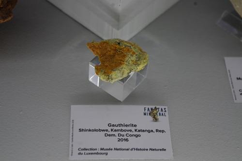 In der Vitrine des Luxemburger Museums war eine Stufe zusehen, auf die mich Tobi aufmerksam gemacht hatte. Es handelt sich um eine Weltklasse Stufe des Minerals Gauthierit aus Shinkolobowe im Kongo.