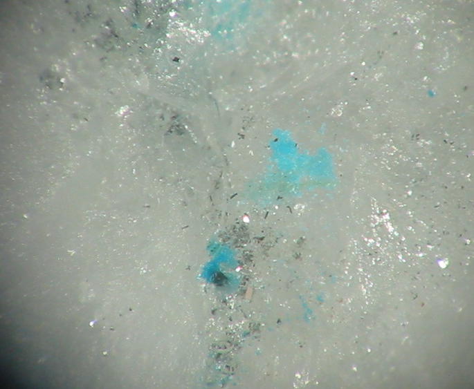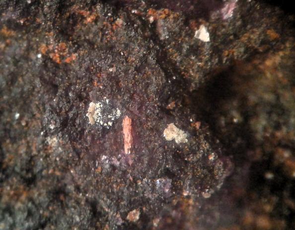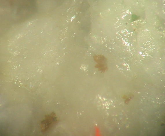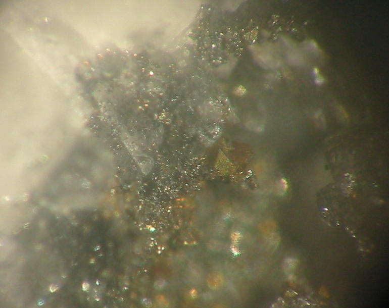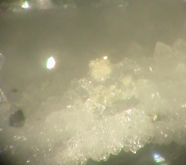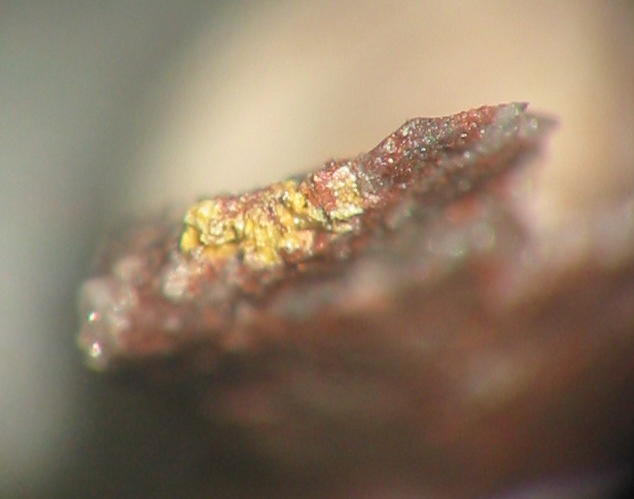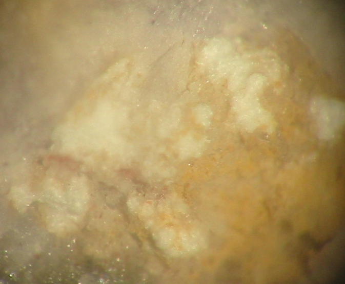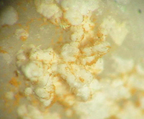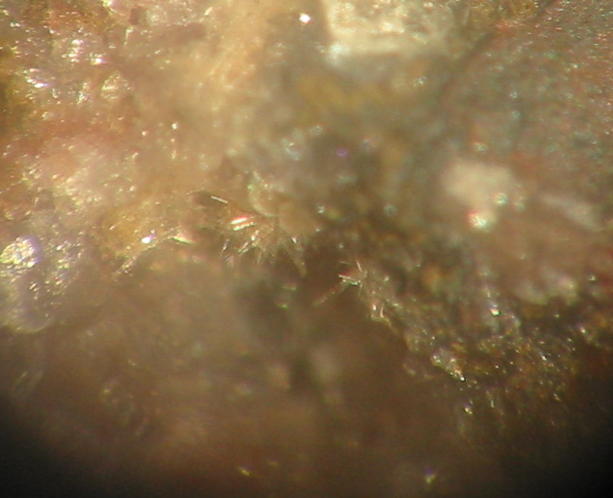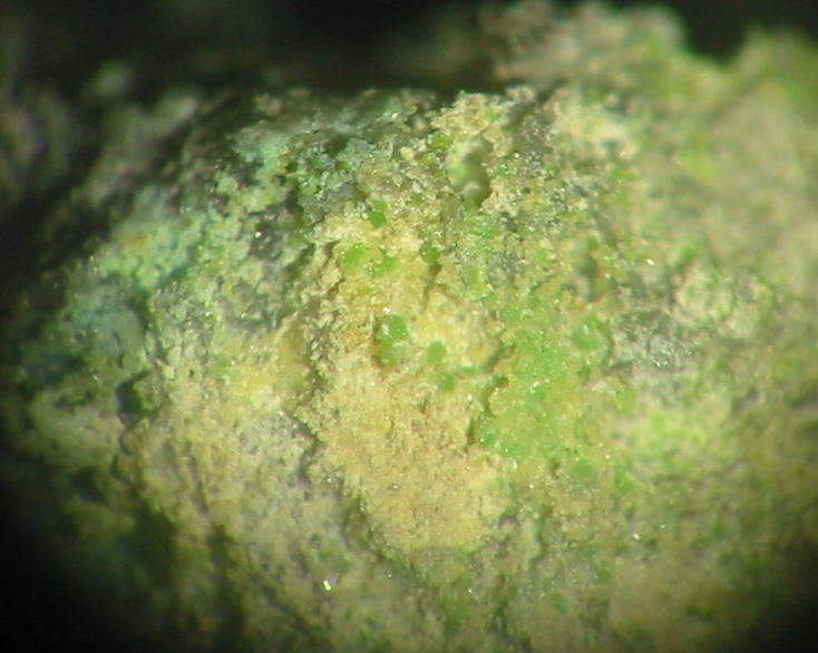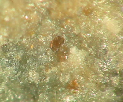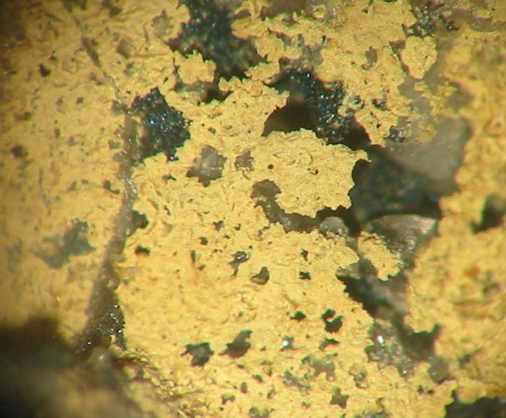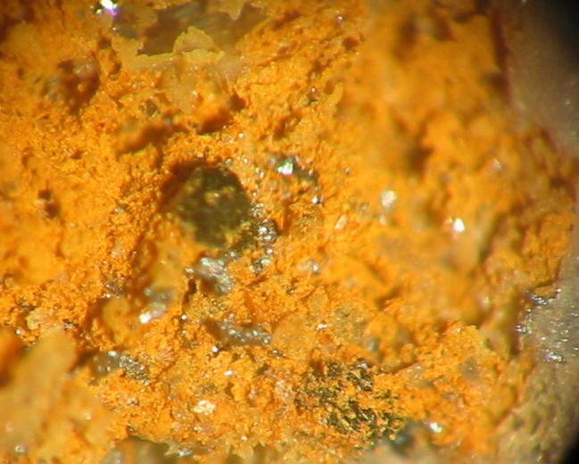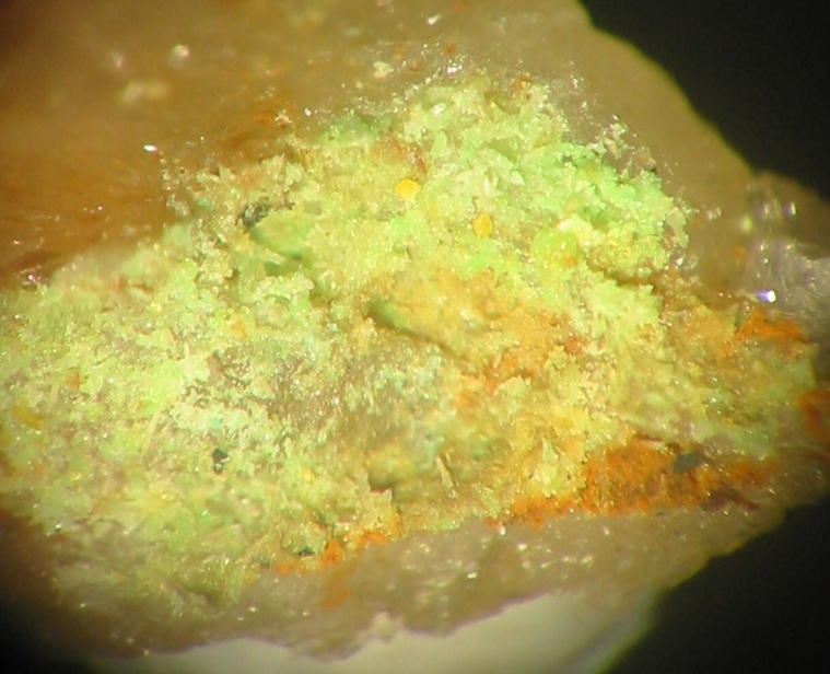 | Information: | Orangegelbe, winzige Dreyeritkristalle (EDX+CCD geprüft) mit schwärzlichen Roscoelith auf Stinkspat. |