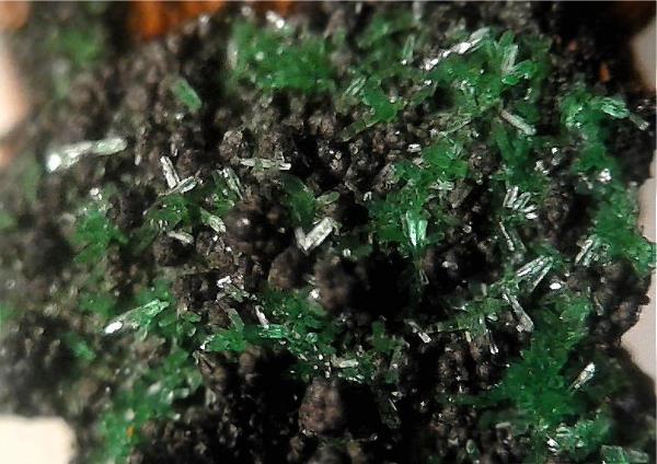 | Information: | Grüner Zinkolivenit auf Kruste von Manganoxiden aufgewachsen. |