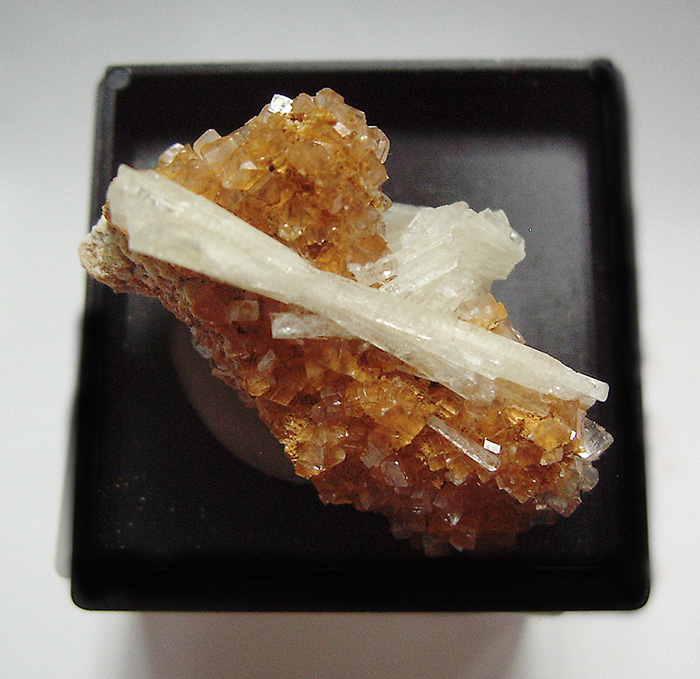 Es geht ja nur um die orangebraunen zahlreichen Kristalle auf denen die weißen Tarnowitzit-Garben sitzen. Könnte vielleicht Fluorit, Baryt oder Calcit sein .. aber ich muss noch genau schauen.